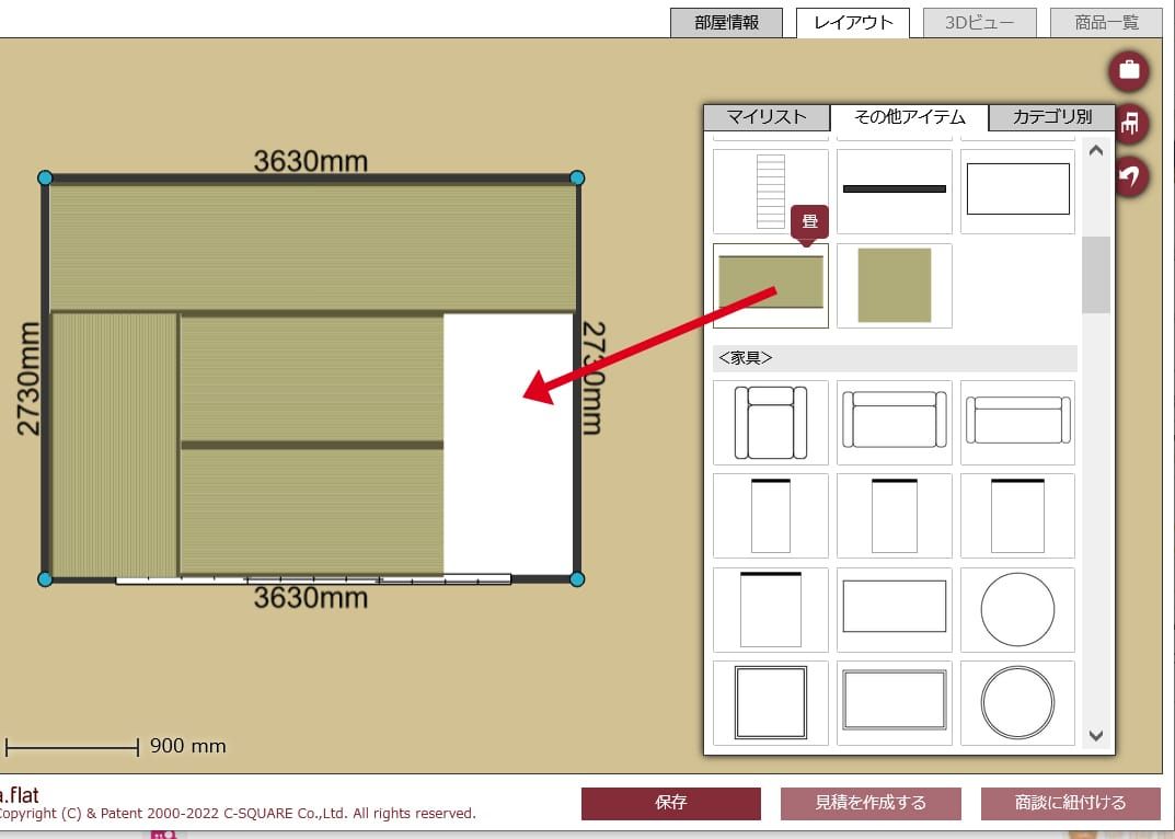 部屋情報タブの「床の色」からは畳を選択することはできません。よってマイルームで畳の床を再現する場合には、その他リストから畳パーツをレイアウト画面にドラッグ&ドロップしてください。