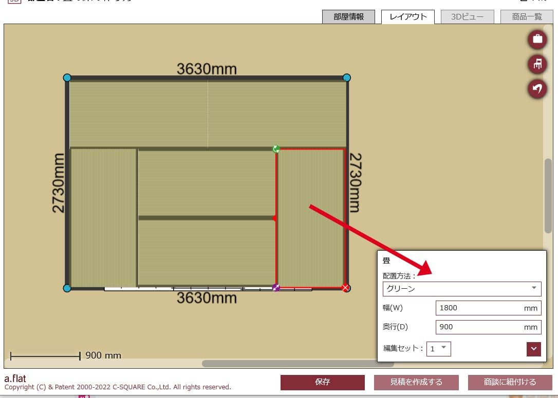 配置したアイテムをクリックすると、赤枠で囲まれます。赤い×印でアイテムを削除、緑の矢印でアイテムの向きを回転することができます。また、右下には商品情報が表示され、a.flatネットショップ内の商品ページを開くこともできます。