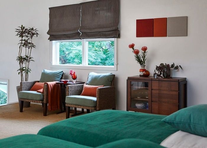 山々の色合いが連なるようなグラデーションをベッドスローやクッションを取り入れることで単調にならず、ホテルライクな空間を演出できます。