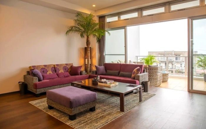 東シナ海を一望できるバルコニーでは、耐久性に優れた屋外用家具を配置。沖縄の自然を思う存分感じていただける贅沢なバルコニーです。