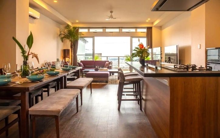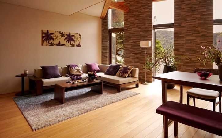色とりどりの紫とシックなグレーが織りなす、モダンリゾートなインテリア事例。紫のアクセントが空間に華やかさを添え、グレーのトーンが全体を引き締めることで、上品でリラックスした雰囲気を演出します。
