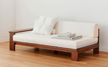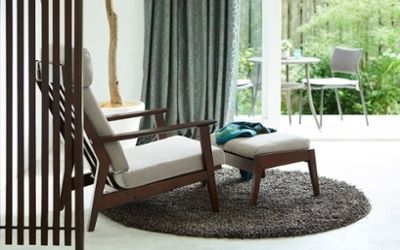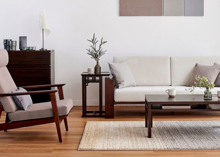 ウッドブラウン・スタイル~自然のベーシック~のページです。木々の温もりやリラックス感を楽しめる、ウッドブラウン・スタイルのリビングコーディネート。無垢材の曲線アームが美しいハイバックソファや、ローテーブルを配置したリビングです。ナチュラルな床色にオフホワイトのソファカバーで合わせた、シンプルなコーディネートが魅力です。茶色のクッションを複数使いしてグラデーションを作りアクセントを付けました。