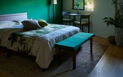 ベッドスローや壁面装飾に、ヤシ柄ファブリックを大胆にあしらって、相性のよいグリーンのクッションで緑の心地良さに包まれます。