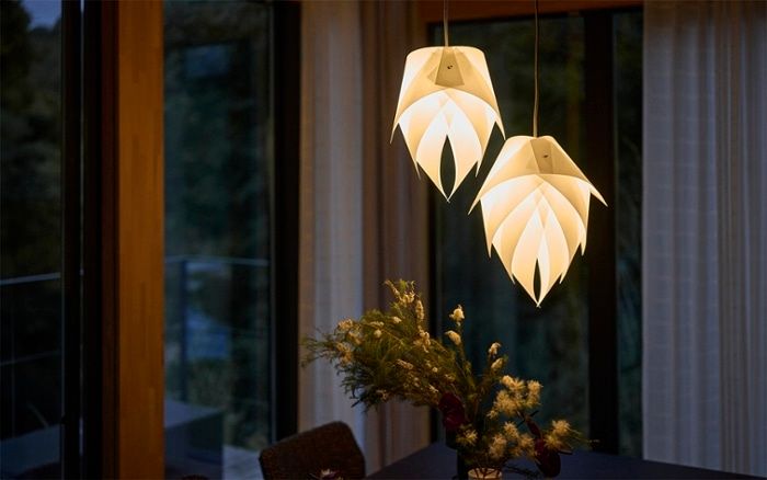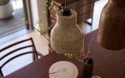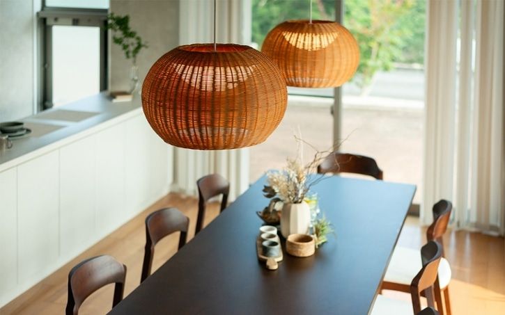 シェードから漏れる灯りが美しい間接照明を添えれば、日が落ちた後の情緒的な雰囲気も楽しめます。照明は陶器や木のフレームが好相性です。