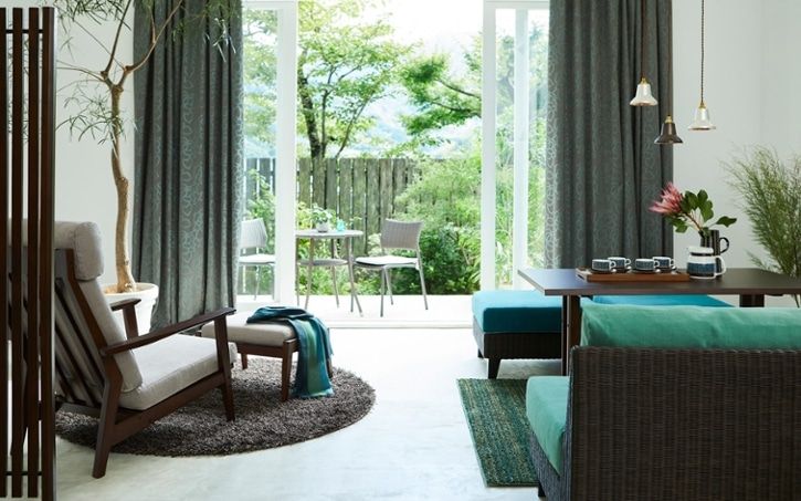 ガーデングリーン・スタイル~爽やかな緑のきらめき~のページです。ガーデングリーンスタイルでリビングやダイニング、寝室を統一すると、アジアンリゾートのような空間が生まれます。ソファやオットマンには「カレイド(CLフォレスト)」のファブリックを、ラグには「ステラ(グリーン)」のシャギータイプを使用し、芝生のようなイメージを演出。リビングのテレビボード周りには、小さめの植栽やエアプランツで自然を感じる空間を作ります。ダイニングでは、「オーランド・ペンダントランプ」とCLフォレストのチェアカバーでさわやかな雰囲気に。寝室は「パウリナ(PUリーフ)」のベッドスプレッドとグリーン系のアクセントでリゾート感を高めます。