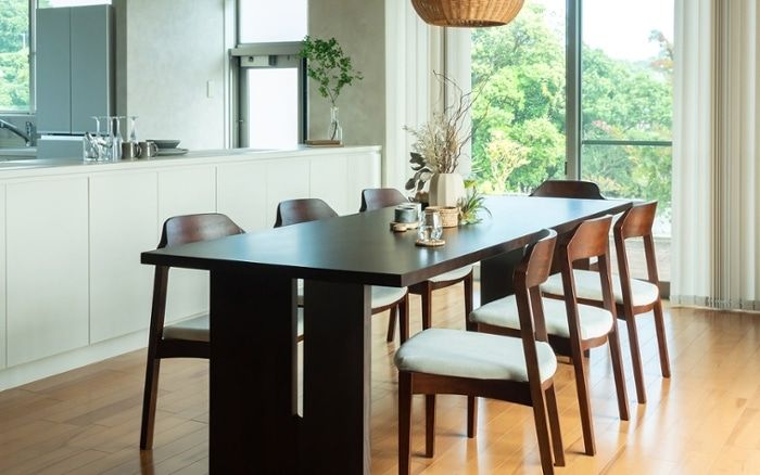 ダイニングスペースには、キッチン前とリビング前の2カ所に広々とした無垢材ダイニングテーブルセットを設置。最大9名程で座れる空間にゆとりを持たせた家具選びがポイントです。