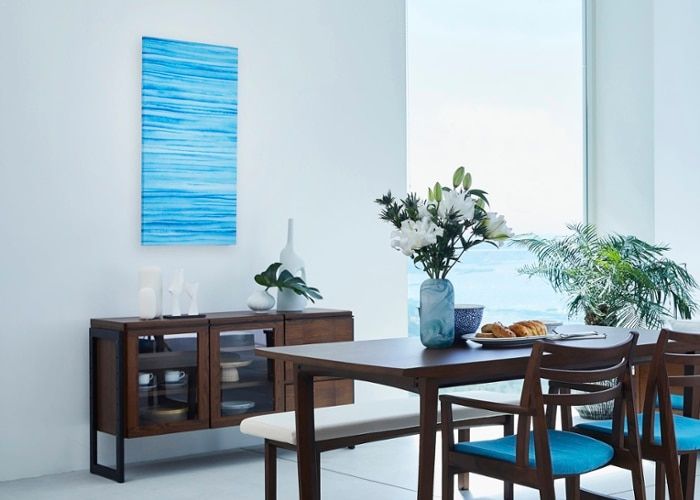 沖縄のような透き通る海をイメージした、ターコイズブルーの色合いが魅力のコーディネート。陽の光を浴びてキラキラと光る海や砂浜の雰囲気で心地よい青の空間を堪能できます。