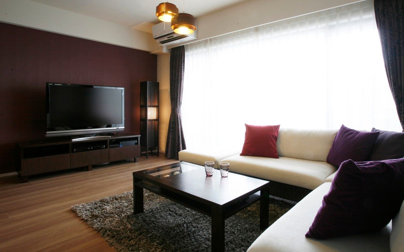 広々としたリビングルーム(2LDK)にラタン素材のコーナーソファセットが中心にレイアウトされています。ダーク調の床に対して赤紫色の壁紙がアクセントとなっていて、クッションカバーのデコレーションも赤や紫で合わせている部分がポイントですね。リゾートホテルのような高級感のあるモダンなインテリアコーディネートだと思います。