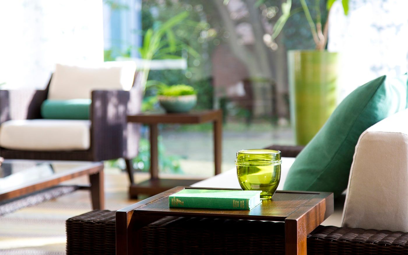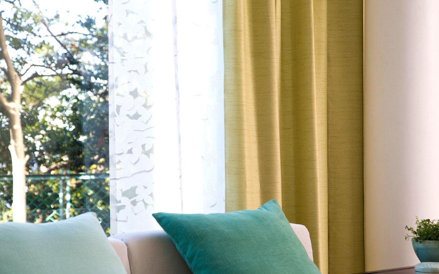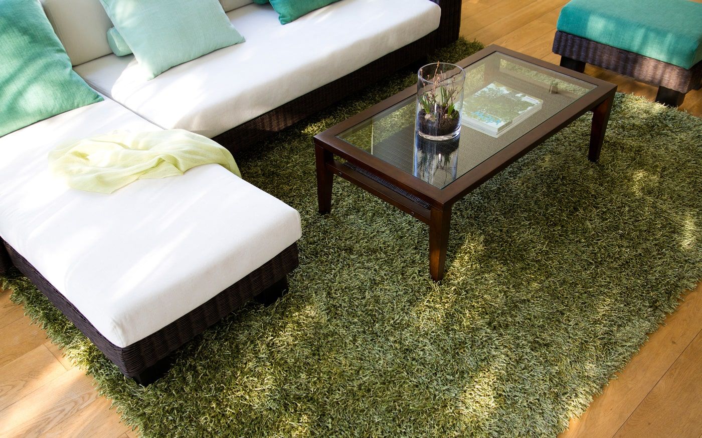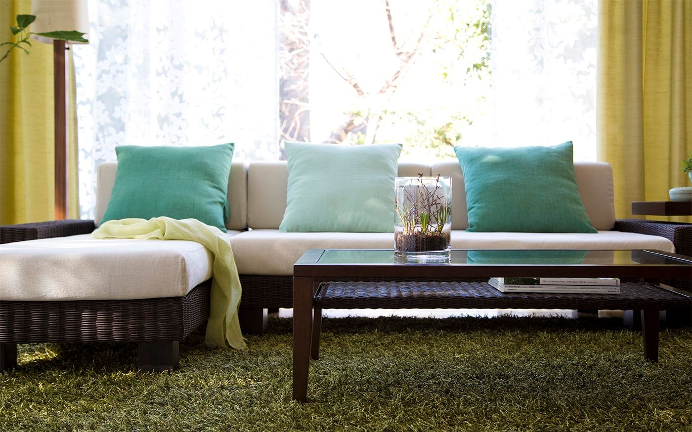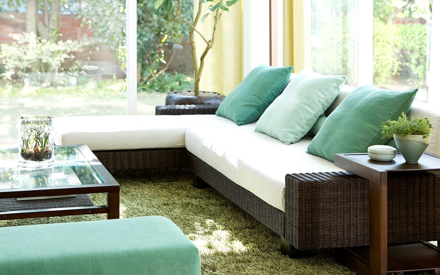 ガーデングリーン・スタイルをリビングで気軽に楽しむには、ソファカバーやラグでグリーンを取り入れてみましょう。「CLフォレスト」のファブリックを中心に、草むらのようなラグ プラド(グリーン)を加えれば部屋の中にリラックス感が漂う緑の空間を味わえます。