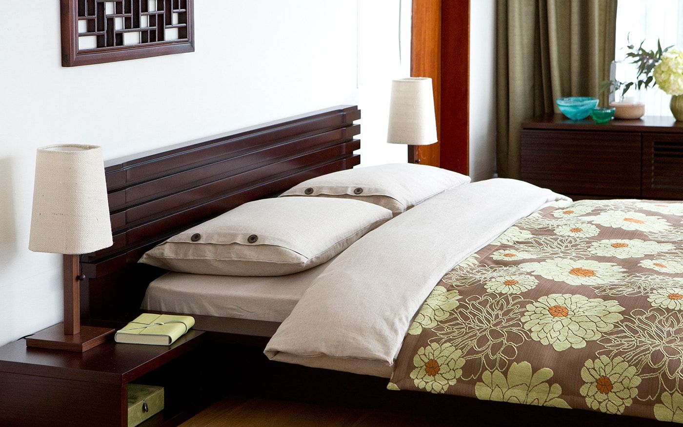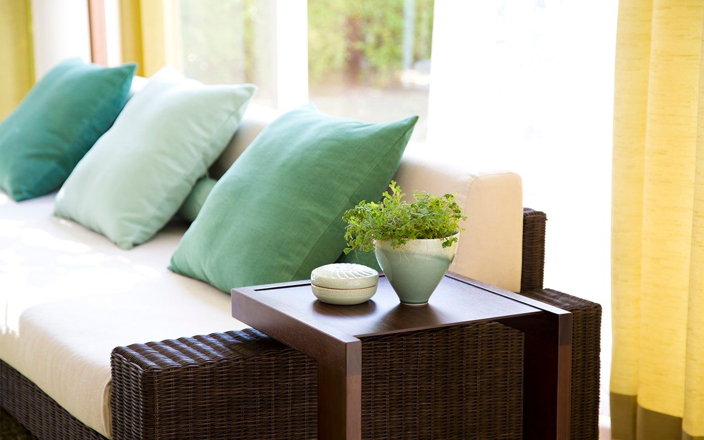 癒しの空気に包まれるような癒しの寝室を作りたい時は、ガーデングリーン・スタイルが最適です。淡いグリーンの花柄を用いた「PUリーフ」のベッドスプレッドや、多彩な緑のクッションカバーでフレッシュなベッドルームを演出してください。