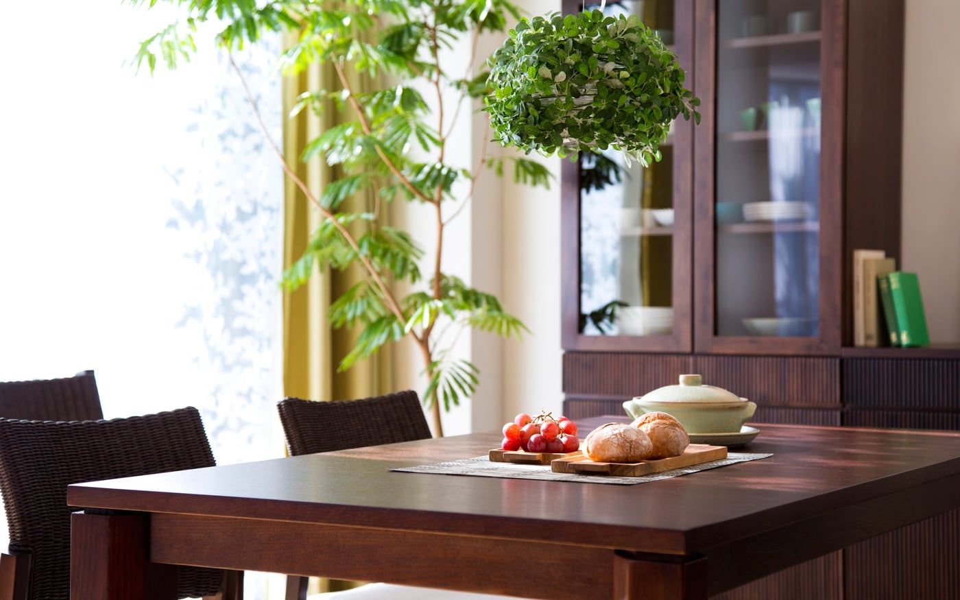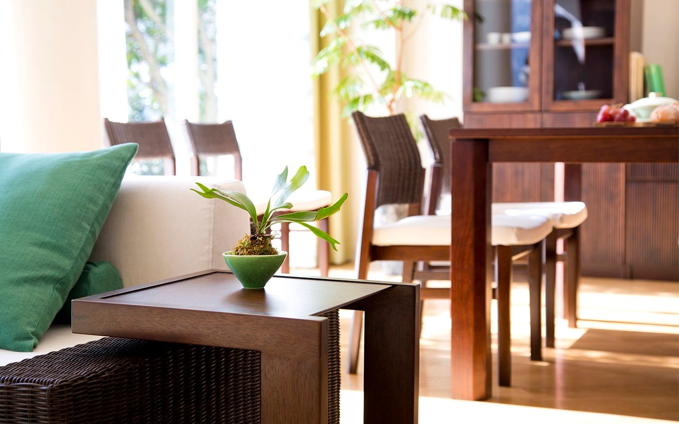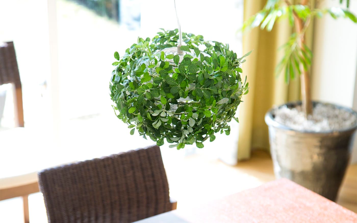 リビング同様にラタン素材やダークブラウンカラーの家具をメインにして、グリーンをプラスしてみましょう。植物をモチーフにしたペンダントライトをアクセントに加えたり、背の高い観葉植物を入れて空間に緑を加えるのがポイントです。