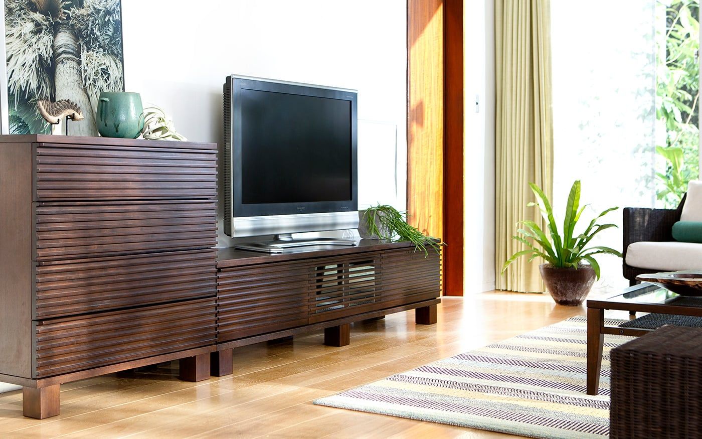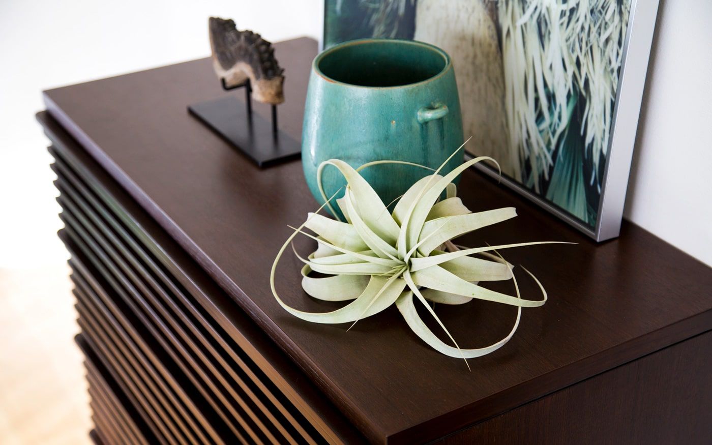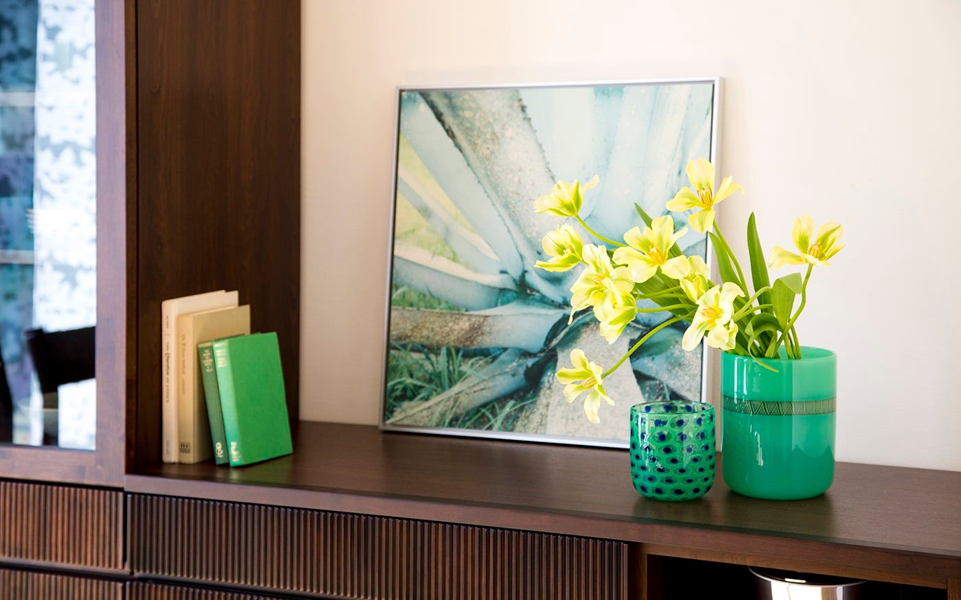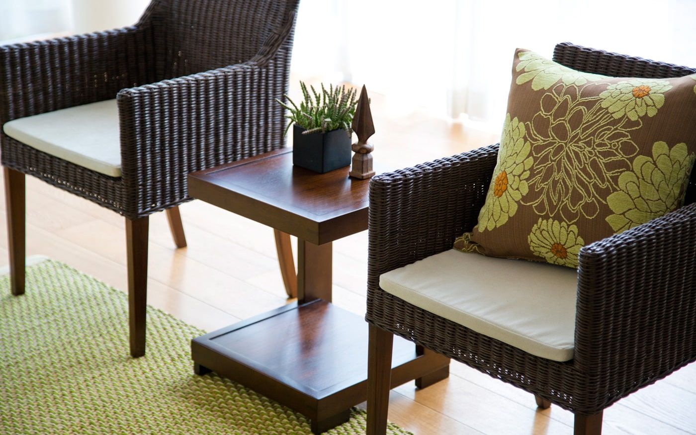 リビング同様にラタン素材やダークブラウンカラーの家具をメインにして、グリーンをプラスしてみましょう。植物をモチーフにしたペンダントライトをアクセントに加えたり、背の高い観葉植物を入れて空間に緑を加えるのがポイントです。