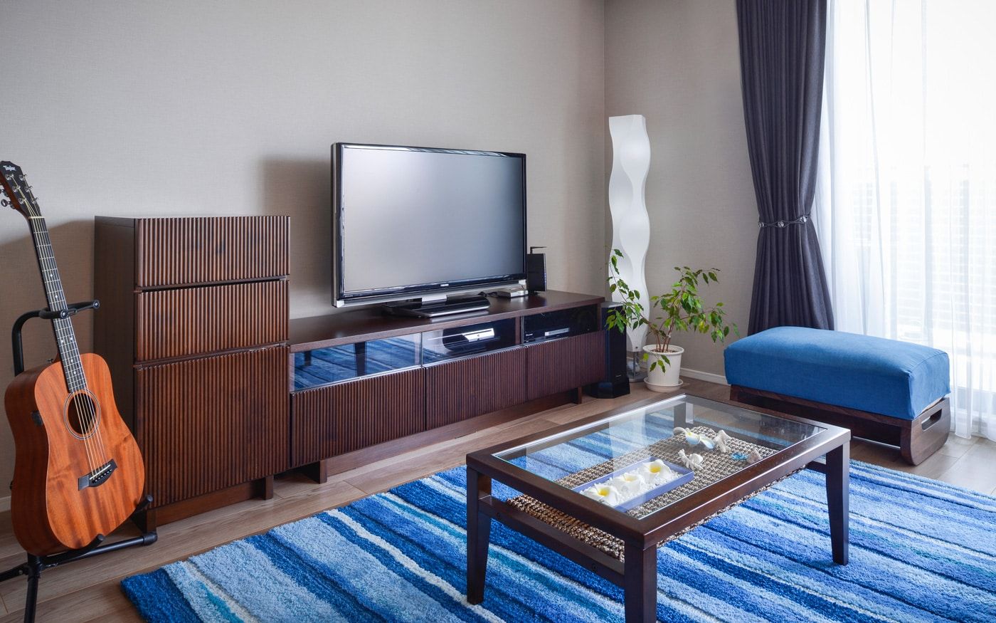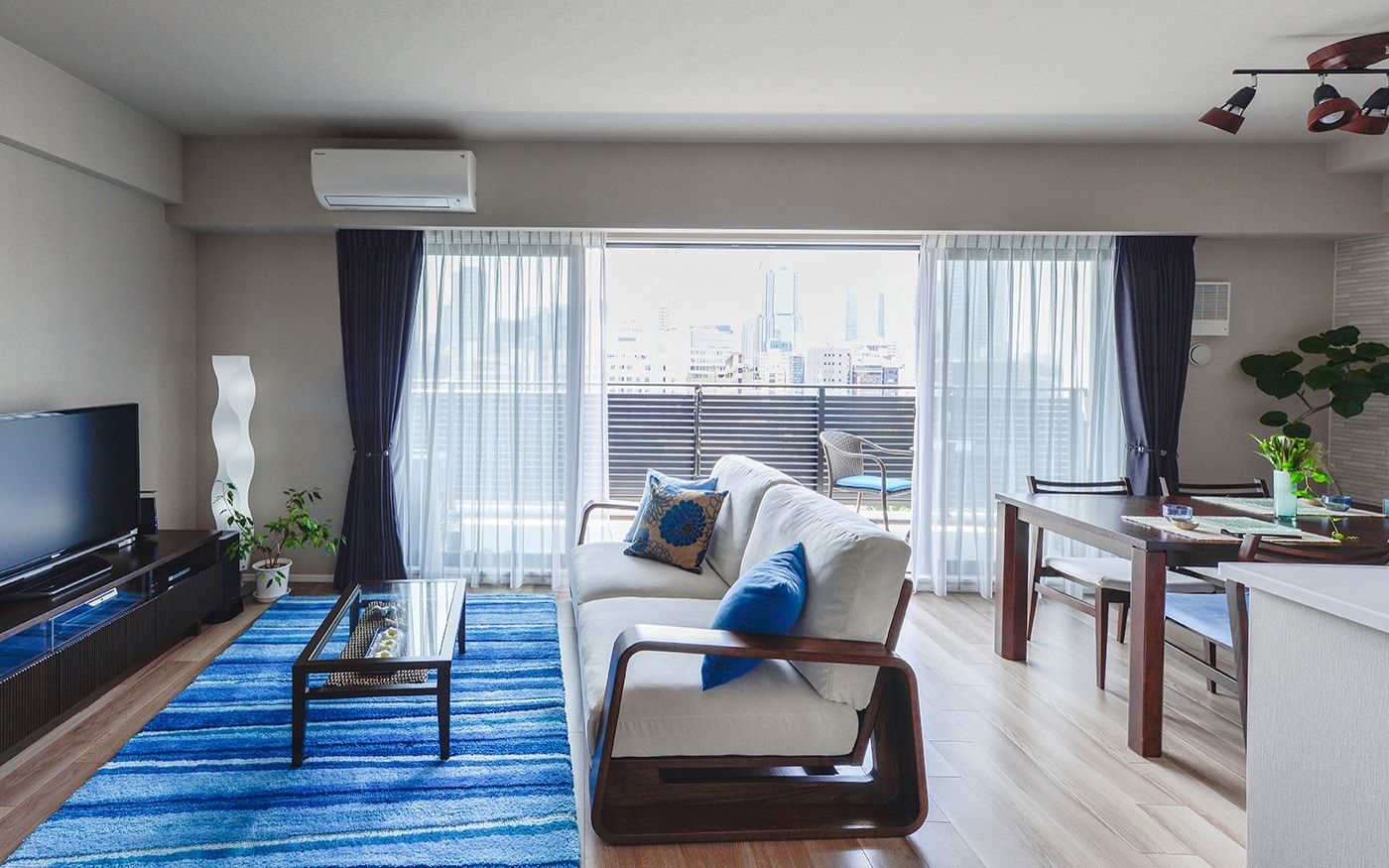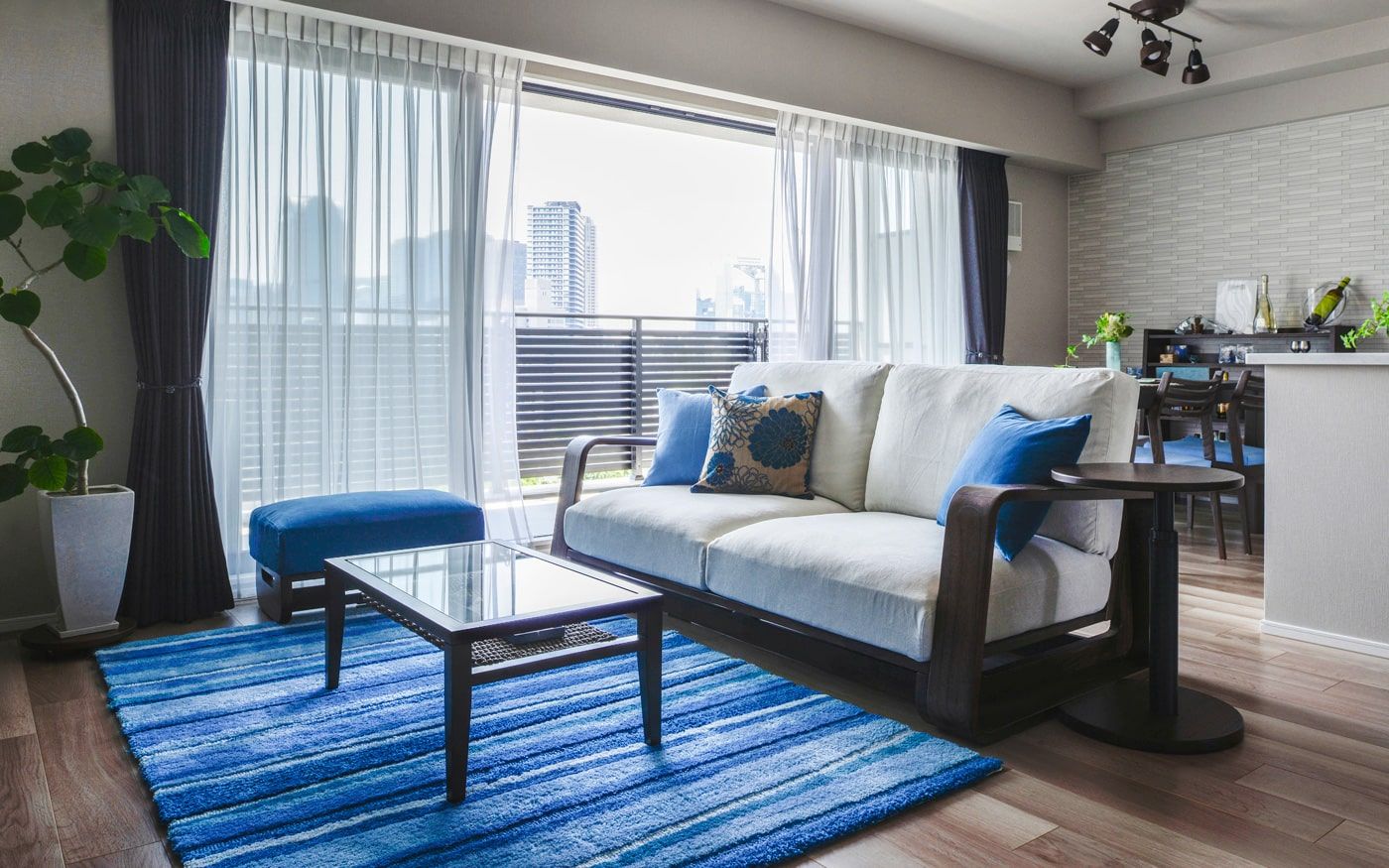 横長リビングをより広く、開放的に見せたいなら、ブルーのカラーコーディネートがおすすめです。ラグやクッション、カーテンにブルーを取り入れ、抜け感のある家具で統一。空と海を感じさせる色使いで、心地よい開放感を演出できます。