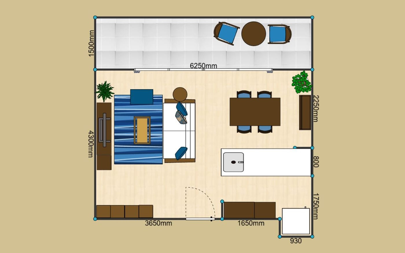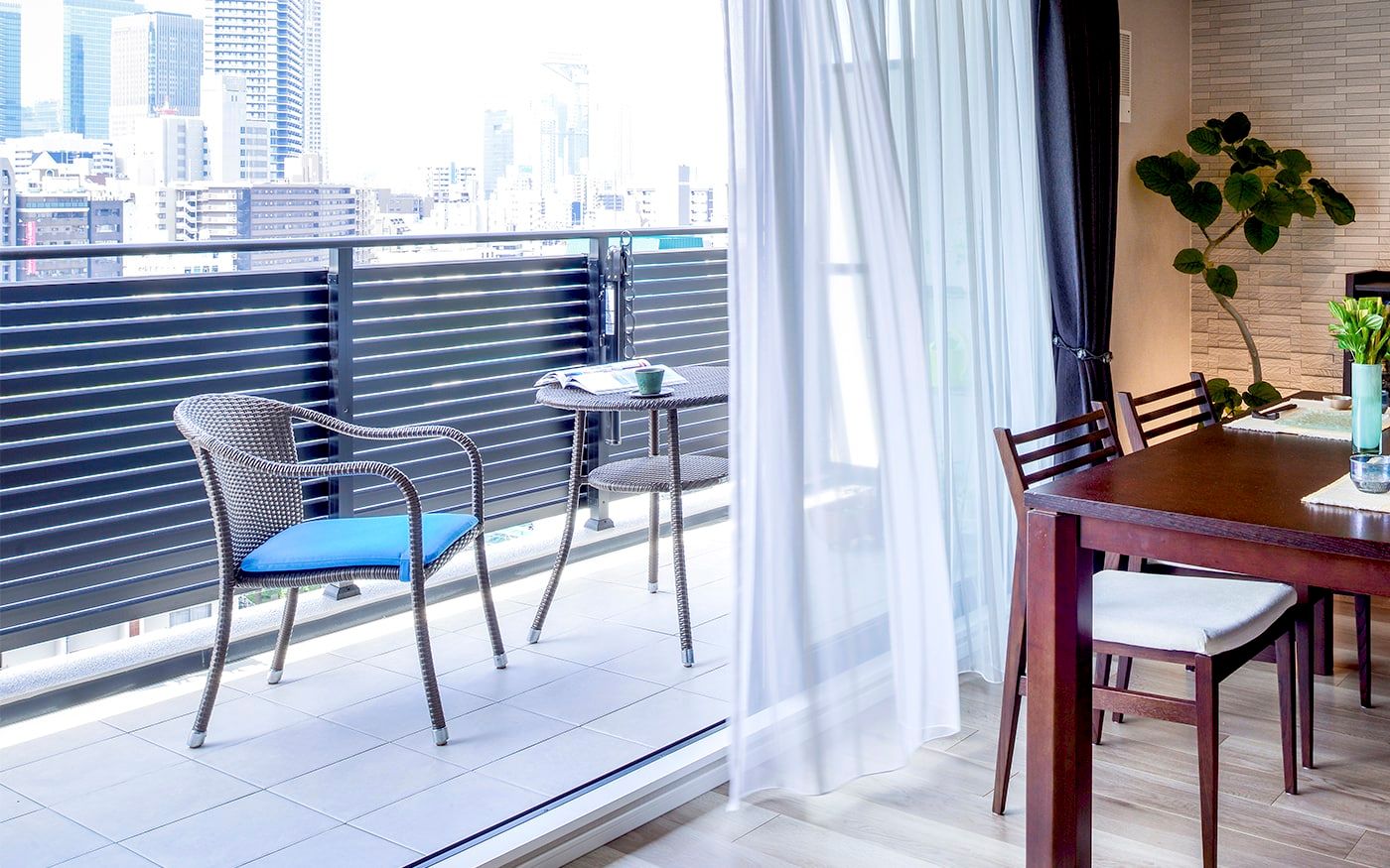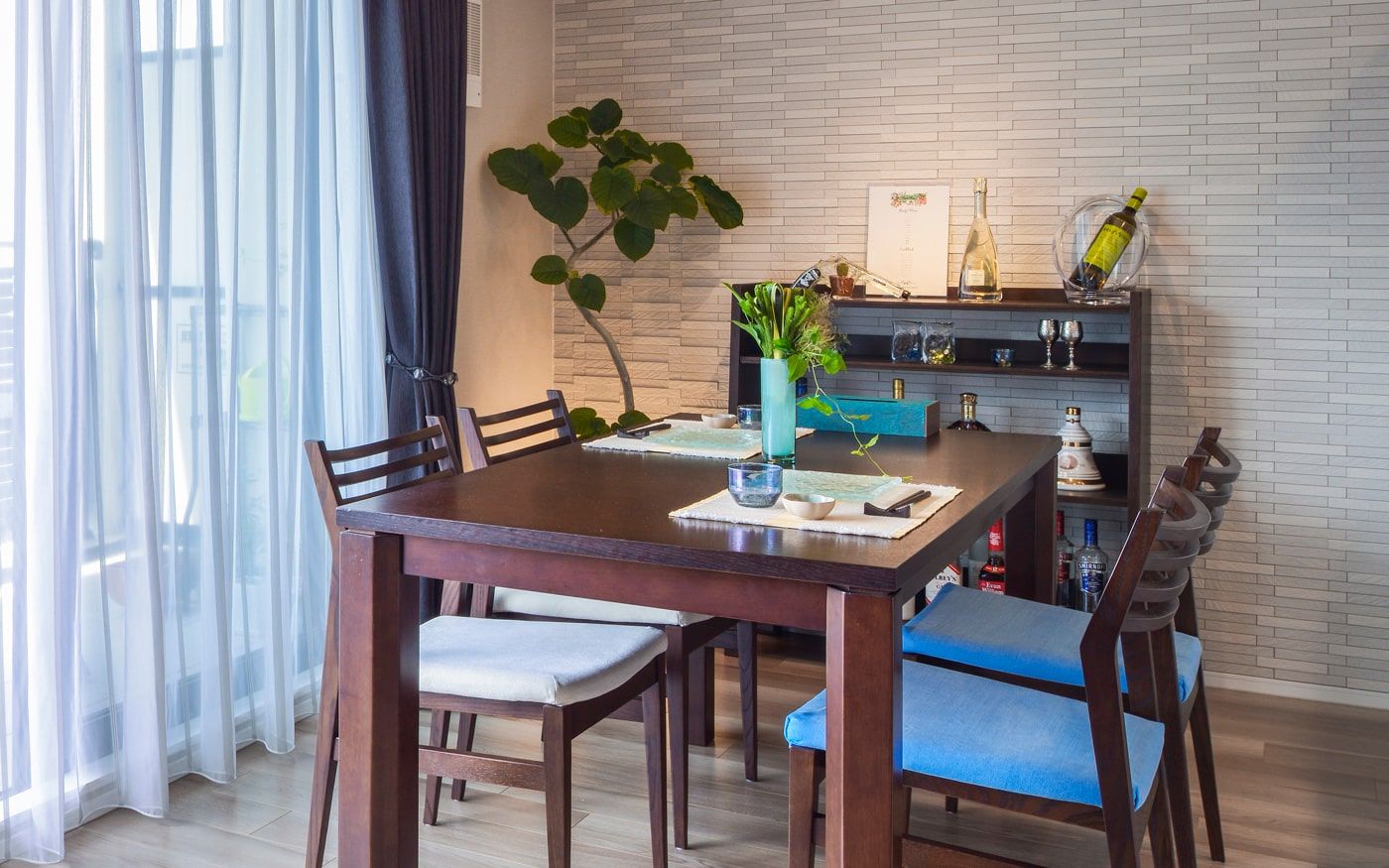 横長リビングをより広く、開放的に見せたいなら、ブルーのカラーコーディネートがおすすめです。ラグやクッション、カーテンにブルーを取り入れ、抜け感のある家具で統一。空と海を感じさせる色使いで、心地よい開放感を演出できます。