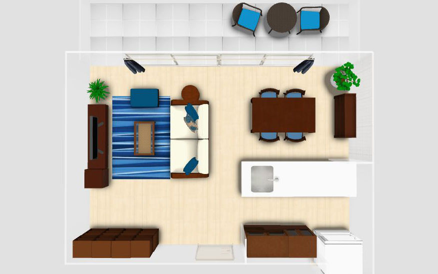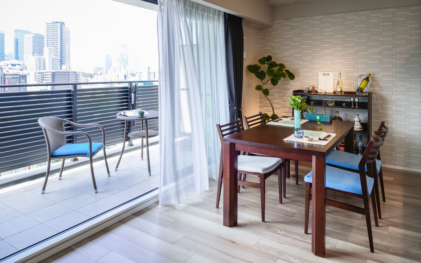 横長リビングをより広く、開放的に見せたいなら、ブルーのカラーコーディネートがおすすめです。ラグやクッション、カーテンにブルーを取り入れ、抜け感のある家具で統一。空と海を感じさせる色使いで、心地よい開放感を演出できます。