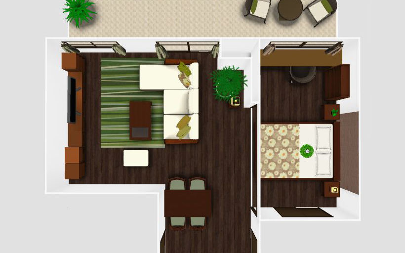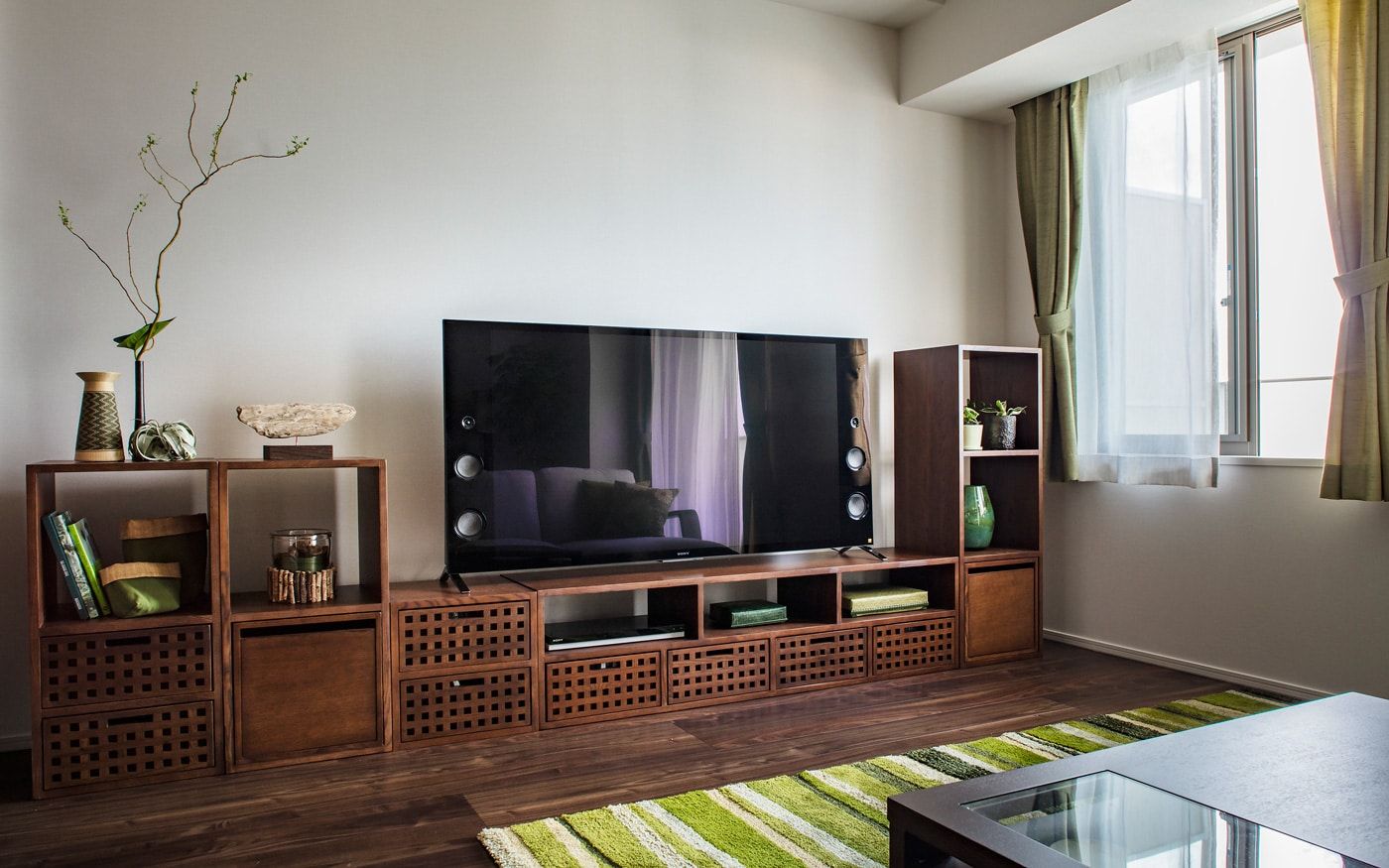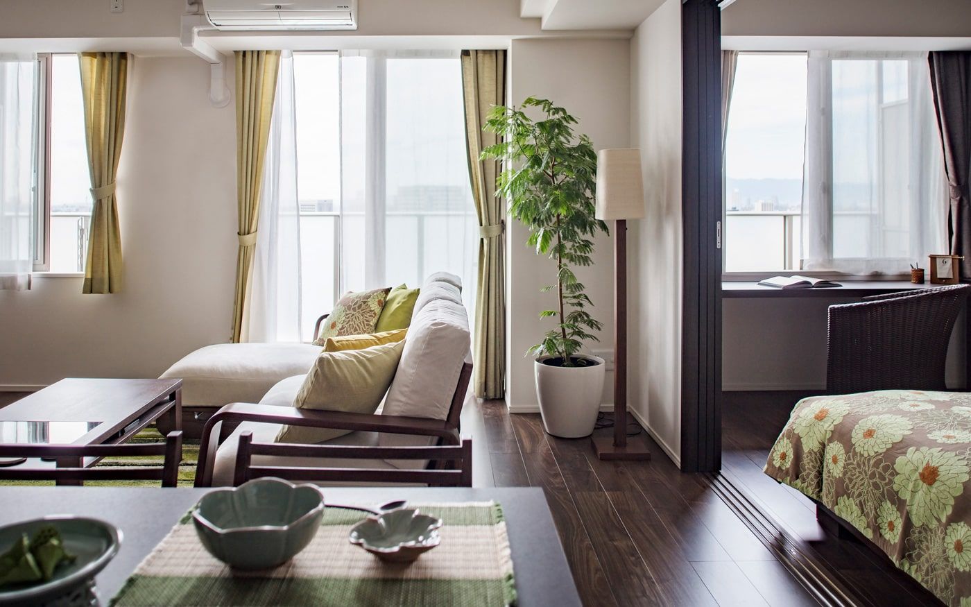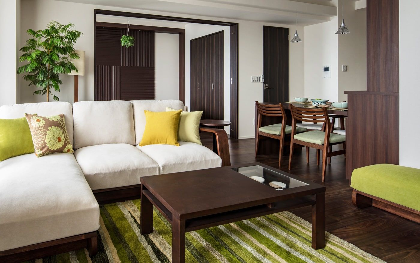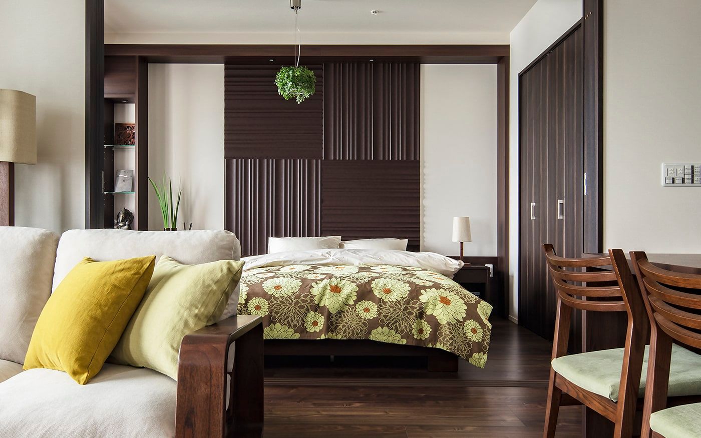 ダークブラウンの床は落ち着いた雰囲気を醸し出しますが、時に重たく感じられることも。そんな時、グリーンの家具やアクセントを取り入れることで、空間に爽やかさをもたらし、床の色を軽やかに見せる効果があります。自然の色彩を取り入れることで、お部屋全体が明るく、活気ある印象に変わります。