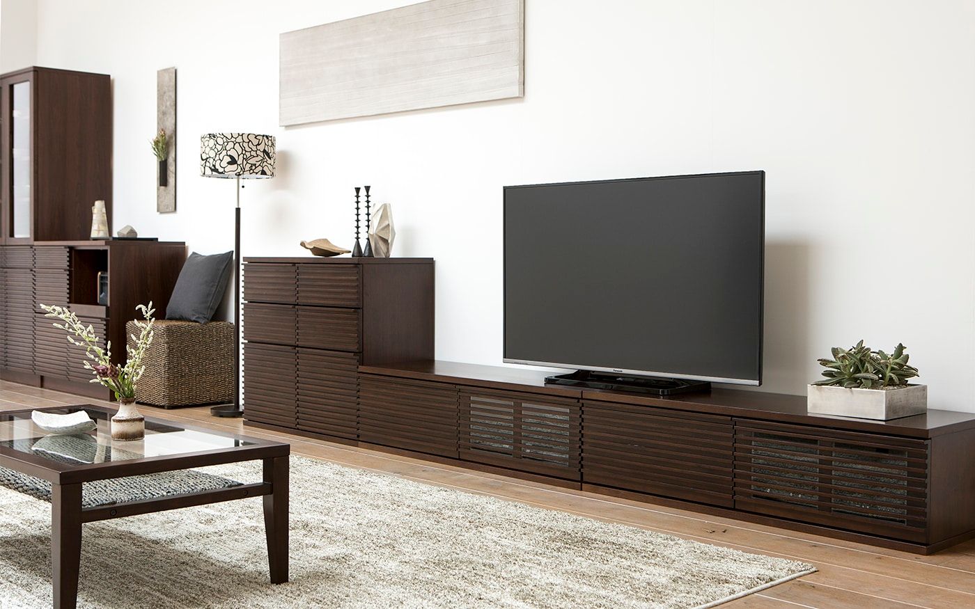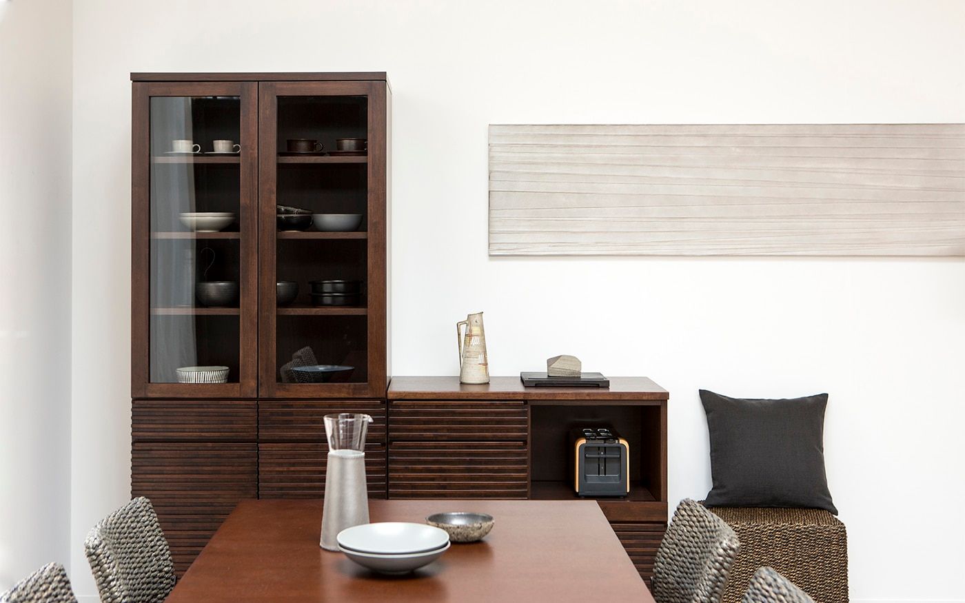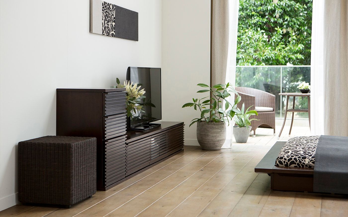 収納家具を美しい水平ラインが魅力のルーバーシリーズで統一し、穏やかな中にも自然の温かみを感じるクラウドグレーでまとめることで、落ち着きのある空間に。ロータイプのテレビボードやローソファをレイアウトし、アジアらしい「床に近い暮らし」を実現するロースタイルのリビングルームに仕上げました。