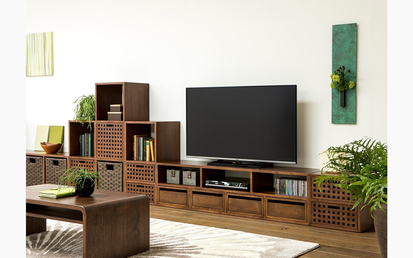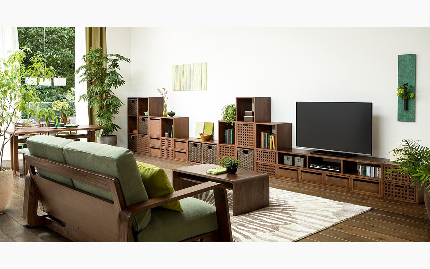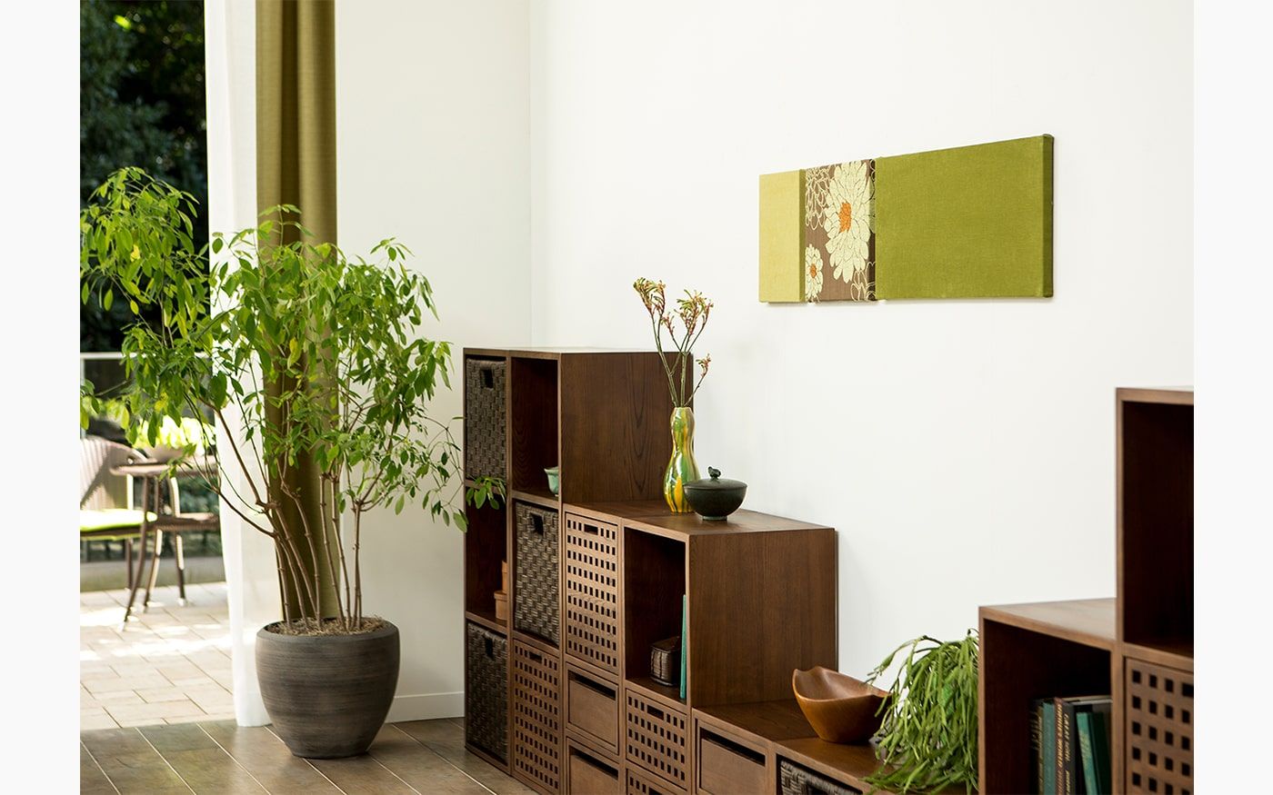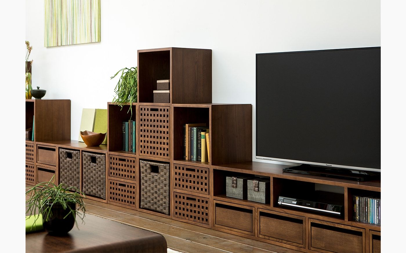 キューブシリーズは格子、フレーム、ラタンの前板デザインが選べます。自由自在にデザインが変えられるのがキューブの魅力。ランダムな前板デザインや形は、空間に心地良いリズム感を与えてくれます。