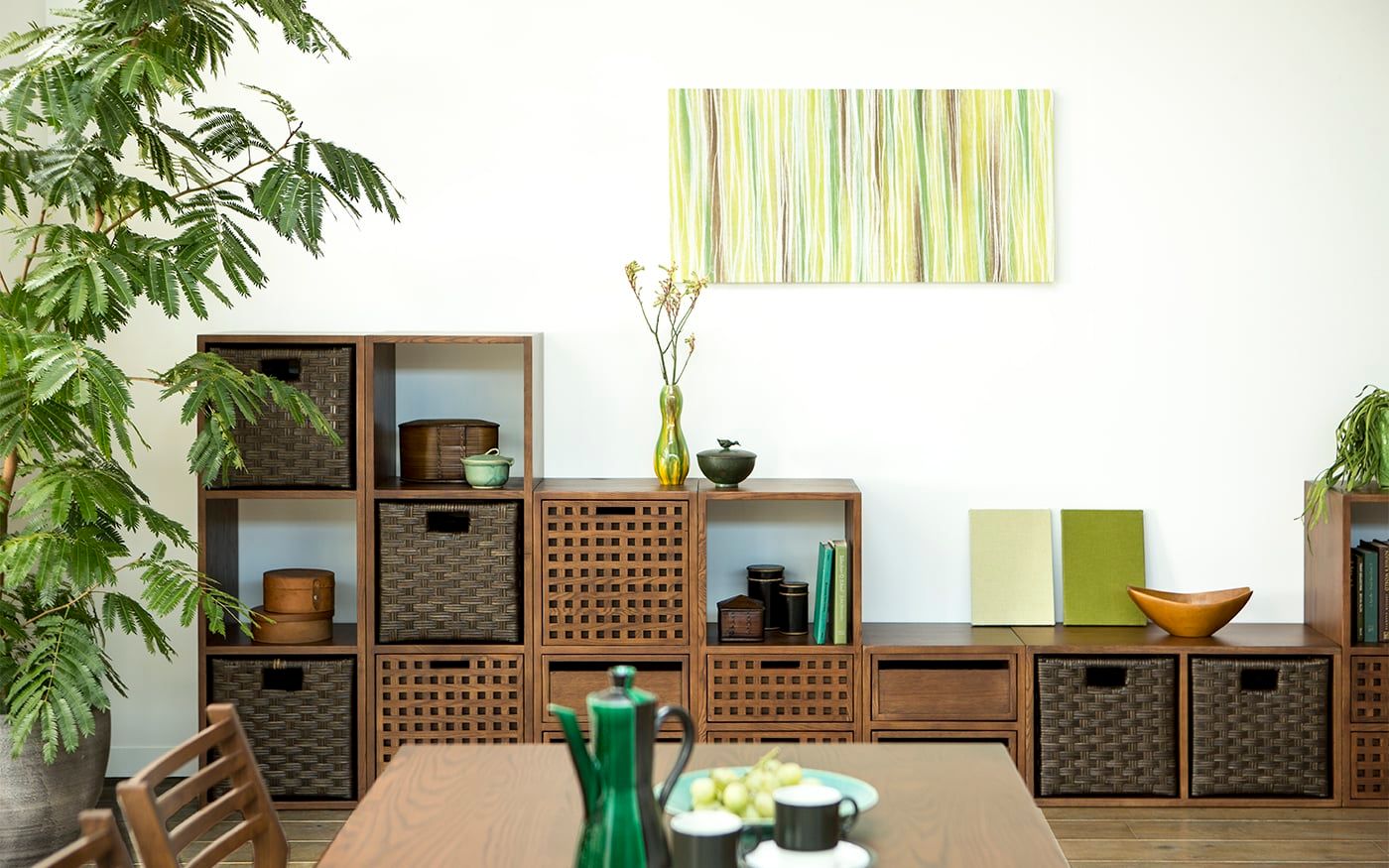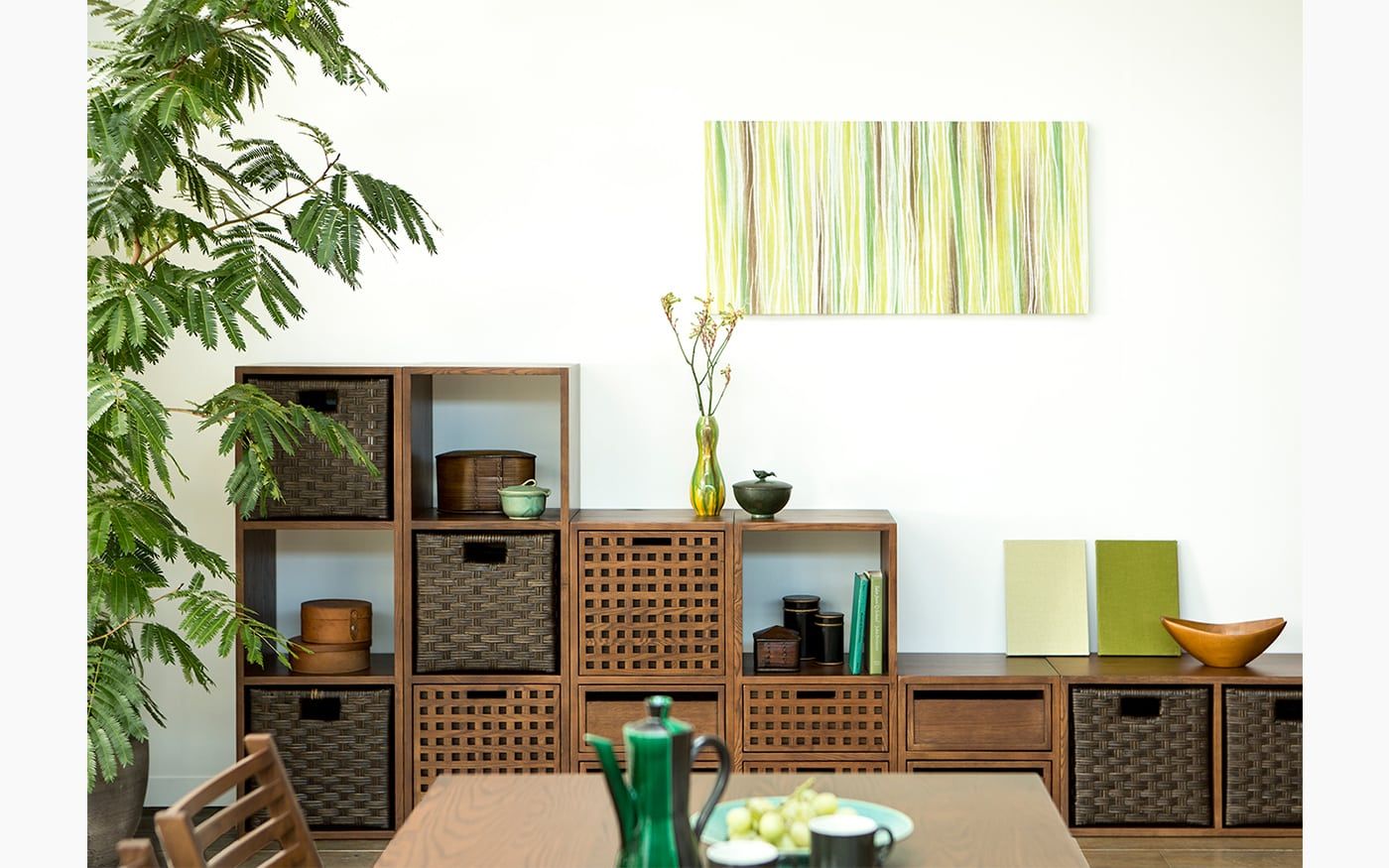 収納量やライフスタイルに合わせて、収納棚のサイズや形、引出の数を自由に増減できる拡張性の高さが魅力です。壁面のアートパネルや高さのあるグリーンが、森のような雰囲気を感じさせます。