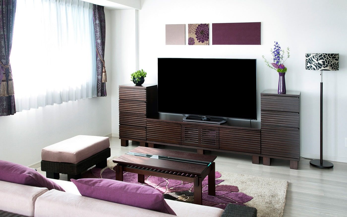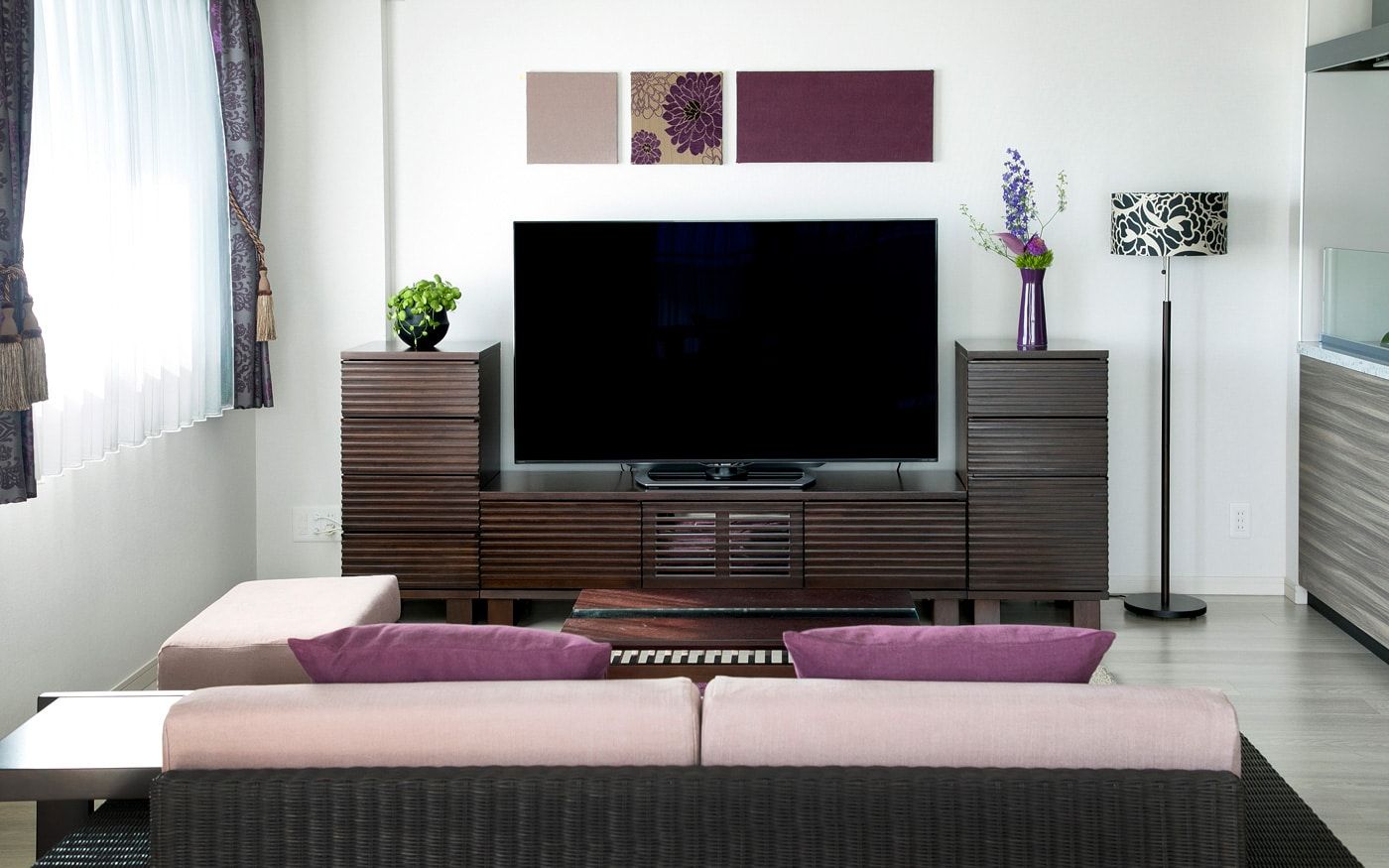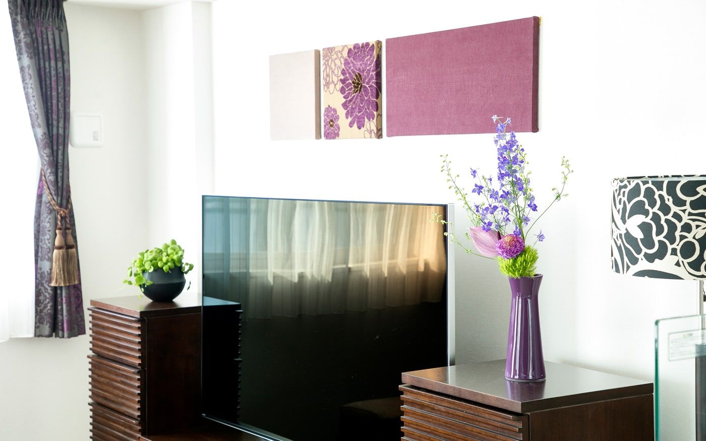 テレビボード上に空いてしまった白い壁には、パープルの壁面装飾を飾りつけ、空間の高い位置にもバランス良くパープルを配色しました。また、落ち着いたグレージュや花柄と組み合わせることで、周辺の家具・ラグとも調和し、パープルという存在感のある色でも、まとまりのある美しいコーディネートに仕上がっています。