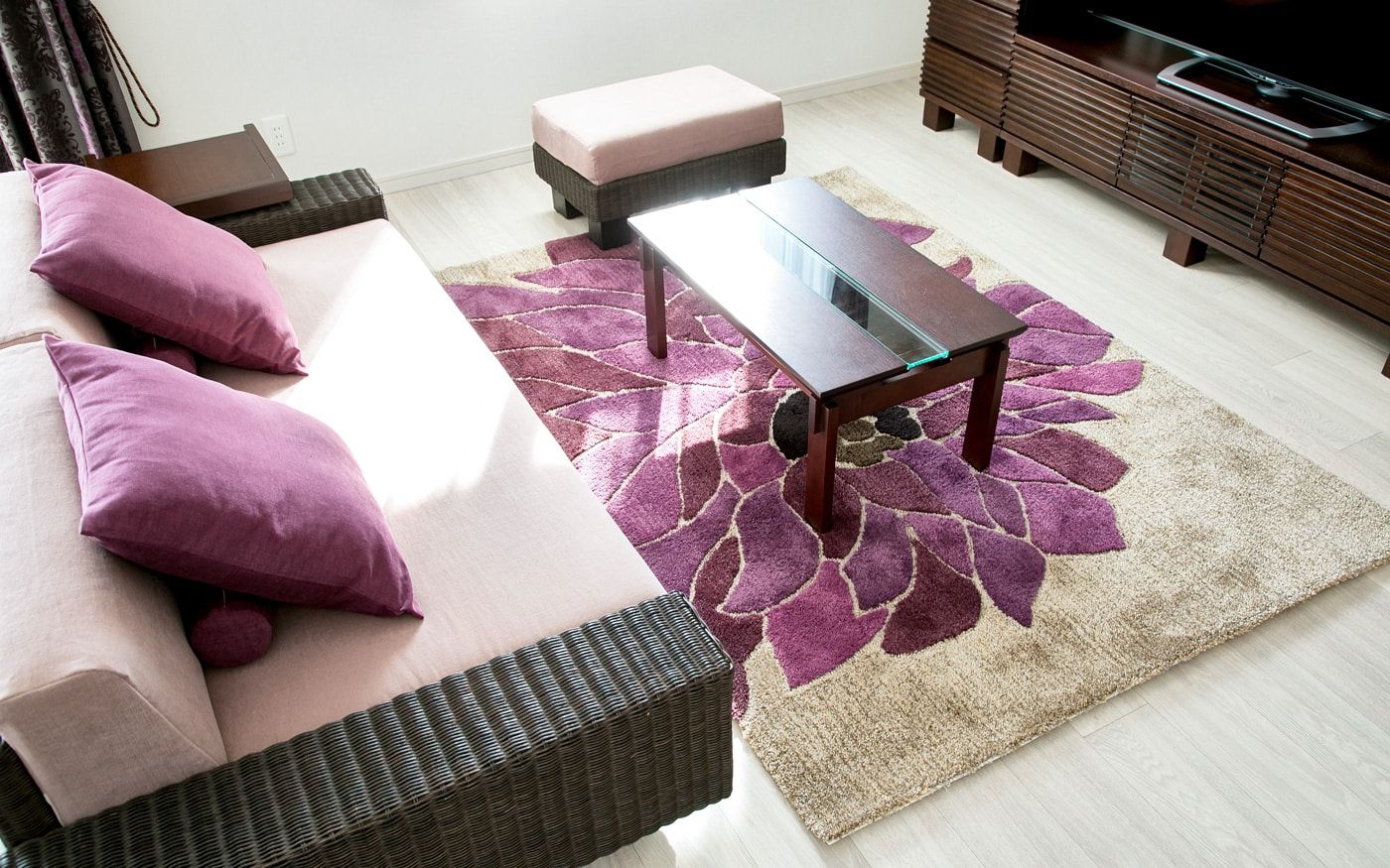 リビングのメインと言えばソファが一般的ですが、こちらは「花柄のパープルラグ」が主役。床に蓮の花が浮かんでいるようなミステリアスな印象で、アジアンリゾートのようなオリエンタルでリラックスムード漂うインテリアを演出しています。また、花柄は単色でなく複数のパープルを重ねたこだわりのおしゃれなデザインです。