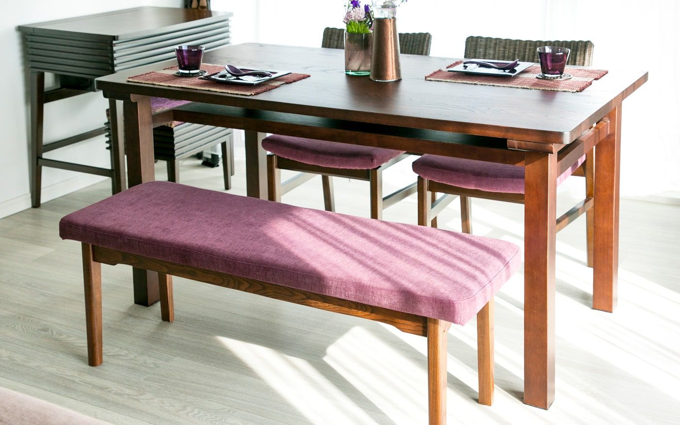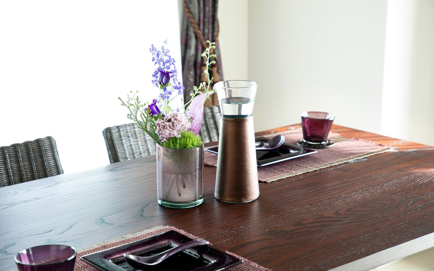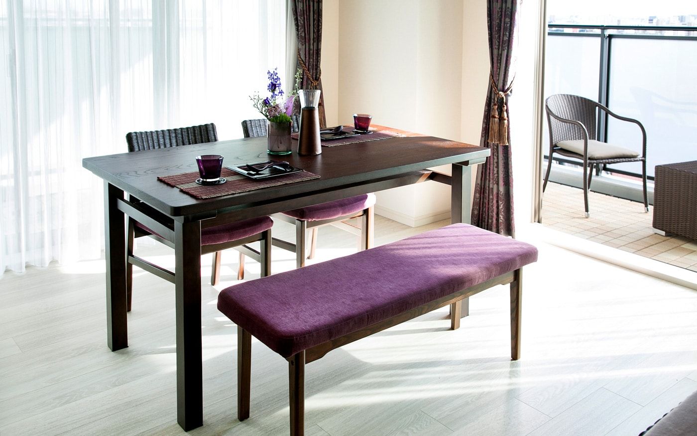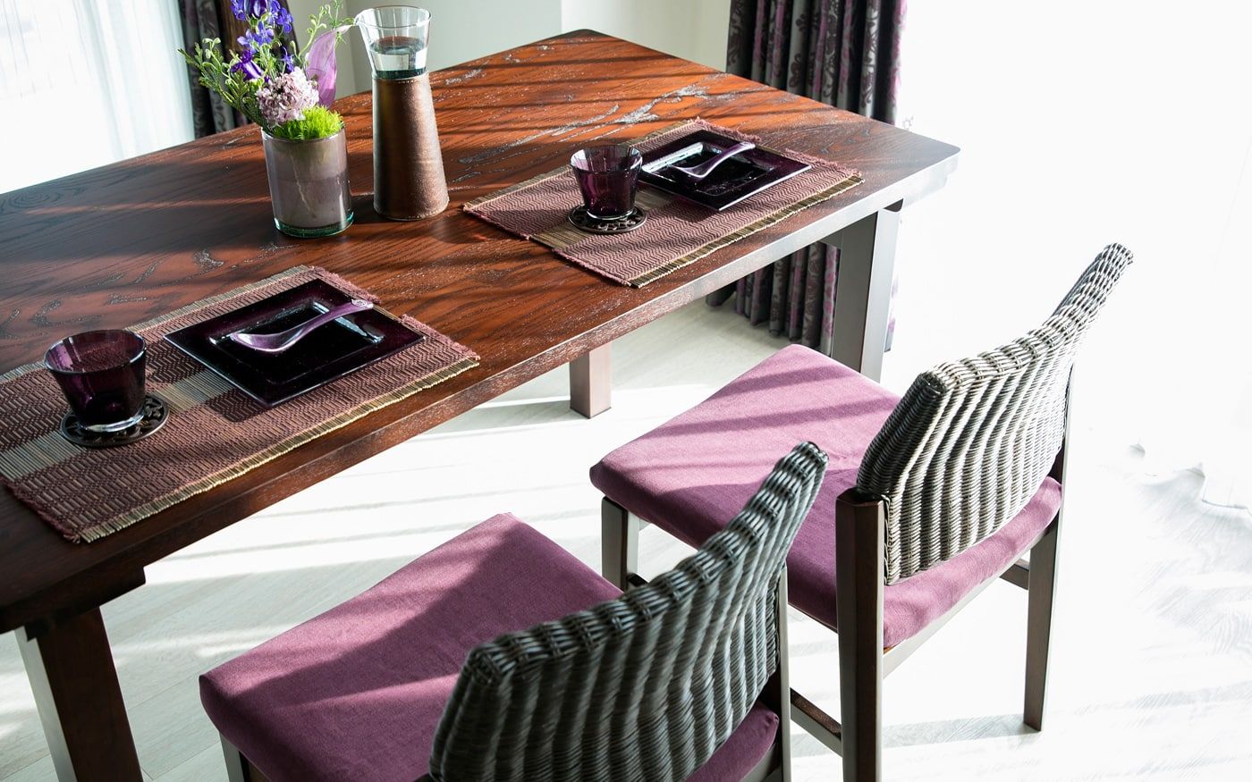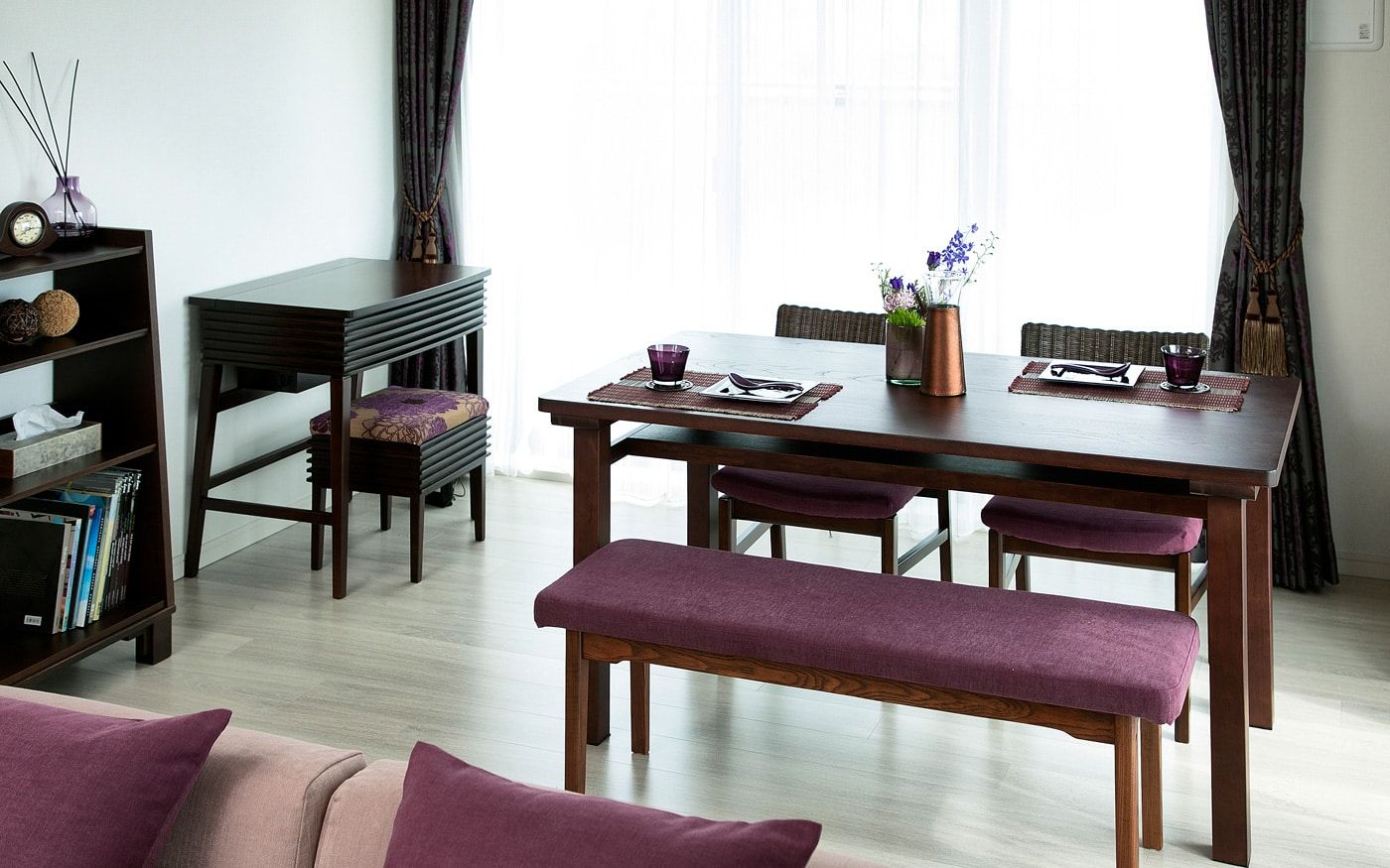 ダイニングテーブルには、木目の美しい無垢材を使用した高級感のあるデザインをセレクト。世界にひとつだけの木目や節、自然のままの温もりを纏った心地良さ、滑らかな手触り、ダークブラウンの深みのある色合い。どれもが、パープルが主役の上品でラグジュアリーなコーディネートにマッチします。