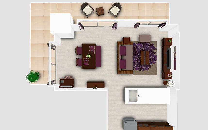 リビングのメインと言えばソファが一般的ですが、こちらは「花柄のパープルラグ」が主役。床に蓮の花が浮かんでいるようなミステリアスな印象で、アジアンリゾートのようなオリエンタルでリラックスムード漂うインテリアを演出しています。また、花柄は単色でなく複数のパープルを重ねたこだわりのおしゃれなデザインです。