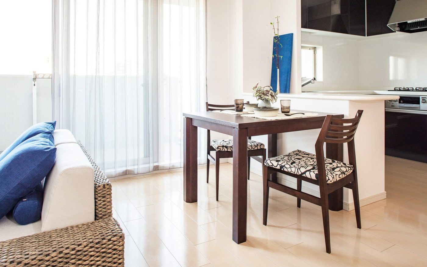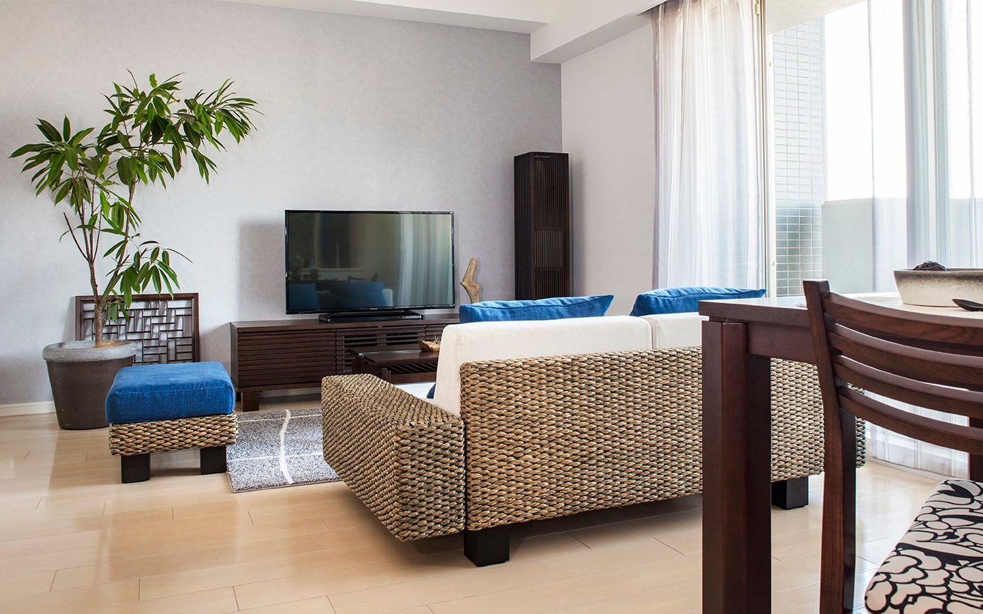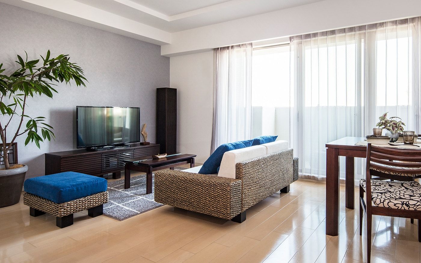 リビングダイニングの主役となるソファ。選ぶものによって空間の見え方が大きく左右されるアイテムです。こちらの実例では、海のような開放感を演出するために「ロースタイル」をセレクト。限られた空間でも、壁感を生まず、さらに天井を高く見せてオープンエアな雰囲気を醸し出してくれます。