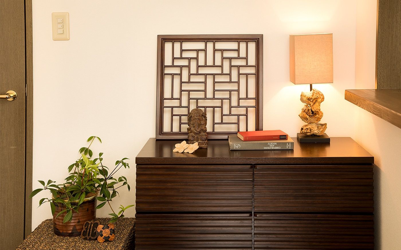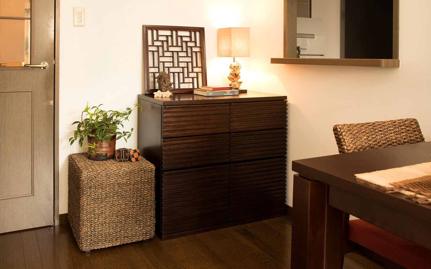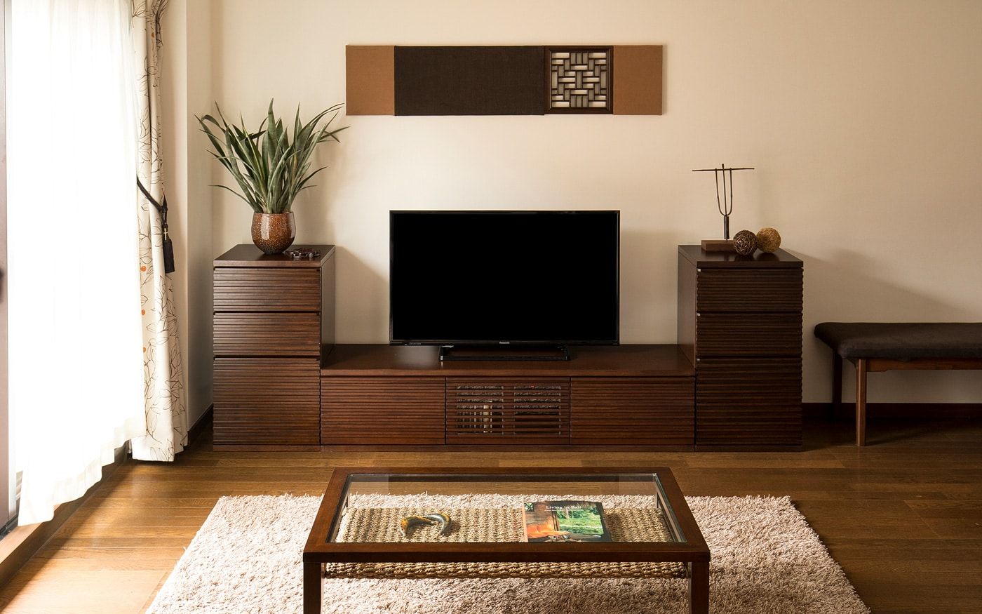 バリには近代的でスタイリッシュなホテルから伝統や趣を感じるホテルなど様々ありますが、今回のご自宅は、自然素材の家具の温もりに癒されるバリのホテルをモチーフにリビングをコーディネートしました。ダークブラウンの深い色合いが落ち着いた雰囲気を醸し出し、アジアンインテリアならではの深い寛ぎを感じられます。