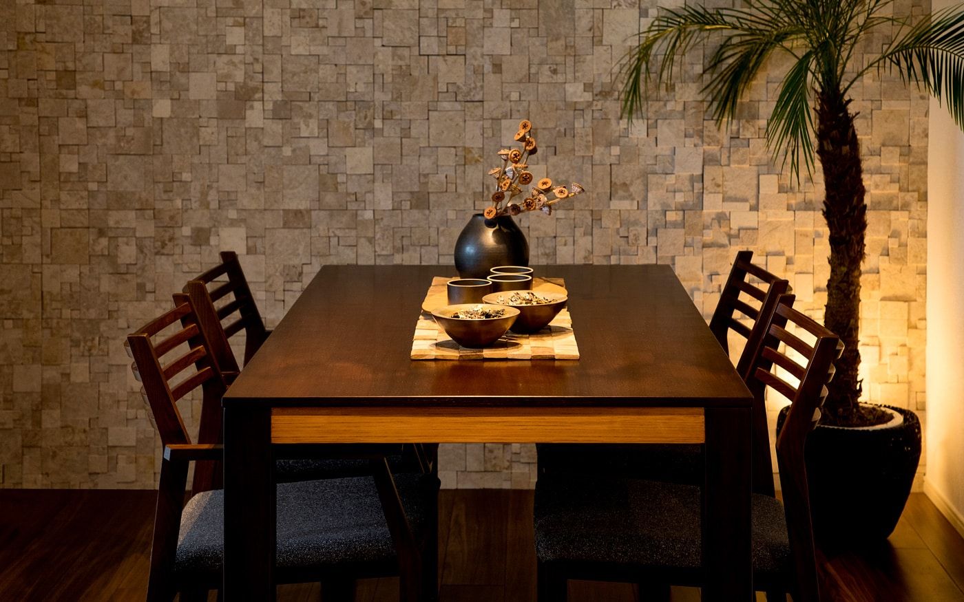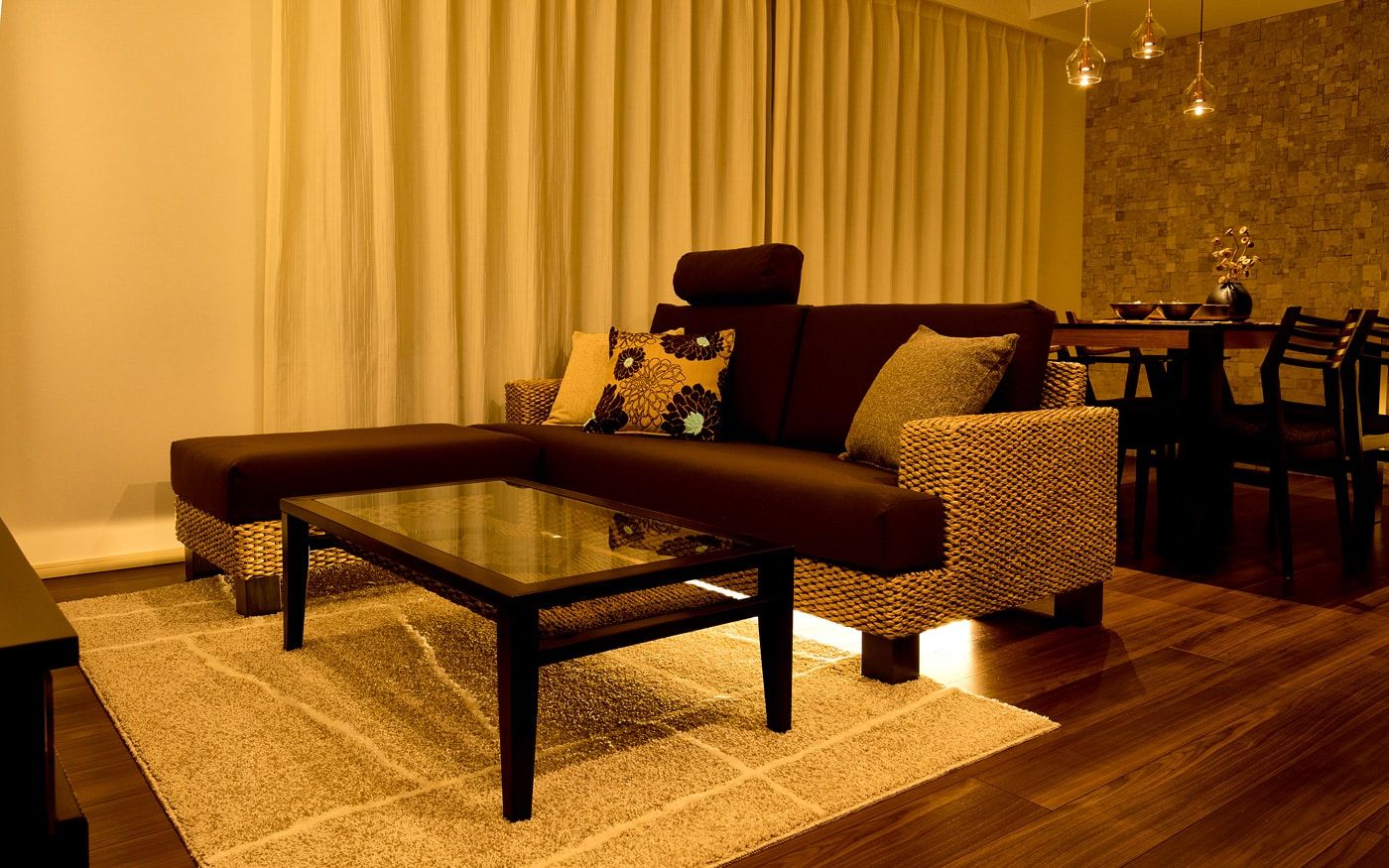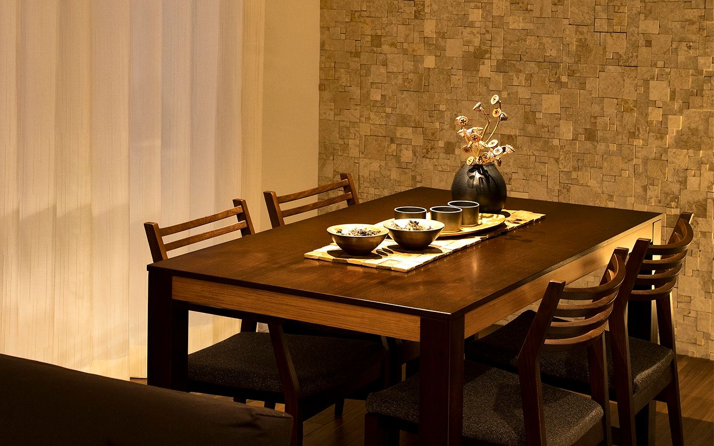 リゾート感溢れるダイニング空間をお家で実現しましょう。ブラウンを基調とした家具でアジアンな雰囲気を演出し、南国の風を感じるアクセントとして観葉植物を加えます。天然素材のカーテンや、壁面材で温もりを添えて、リゾートムードを味わえるでしょう。