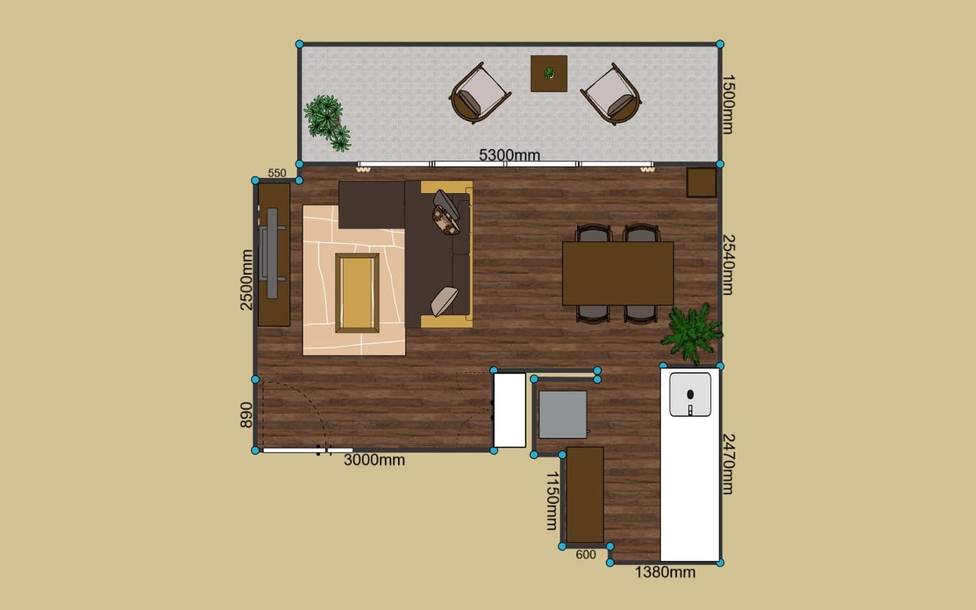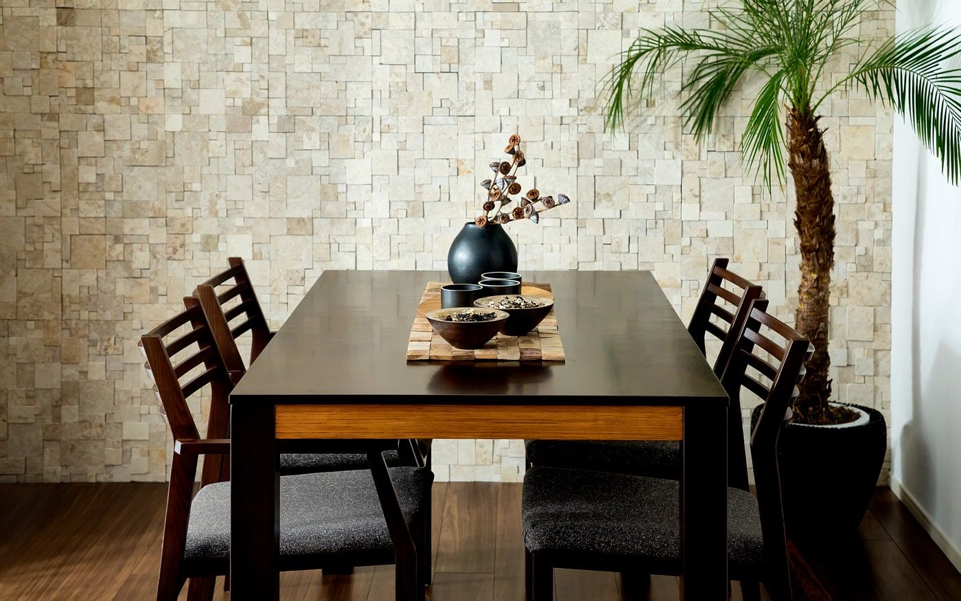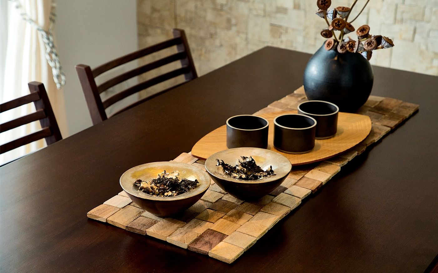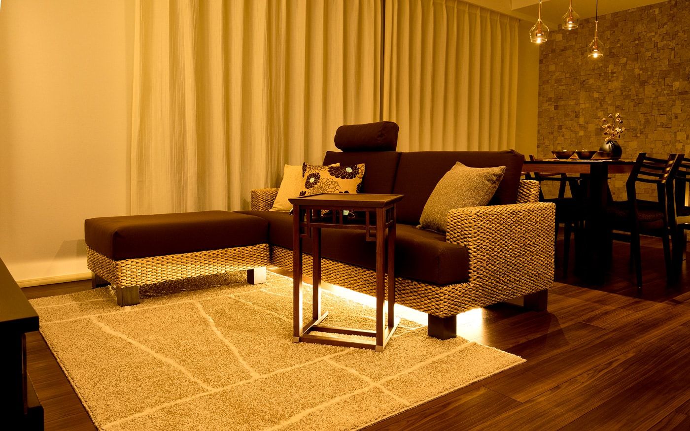 リゾート感溢れるダイニング空間をお家で実現しましょう。ブラウンを基調とした家具でアジアンな雰囲気を演出し、南国の風を感じるアクセントとして観葉植物を加えます。天然素材のカーテンや、壁面材で温もりを添えて、リゾートムードを味わえるでしょう。
