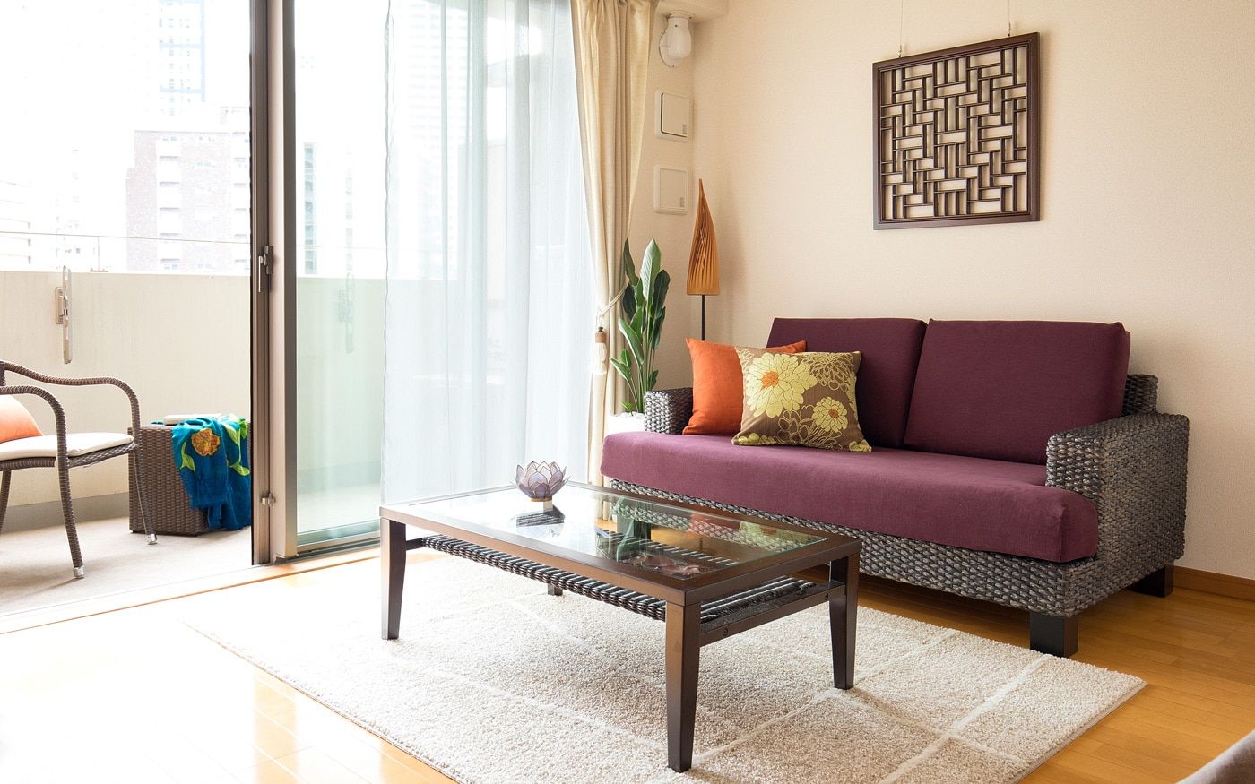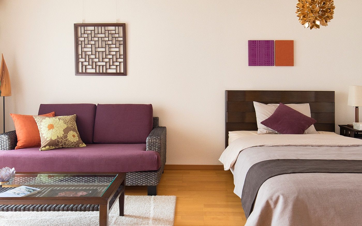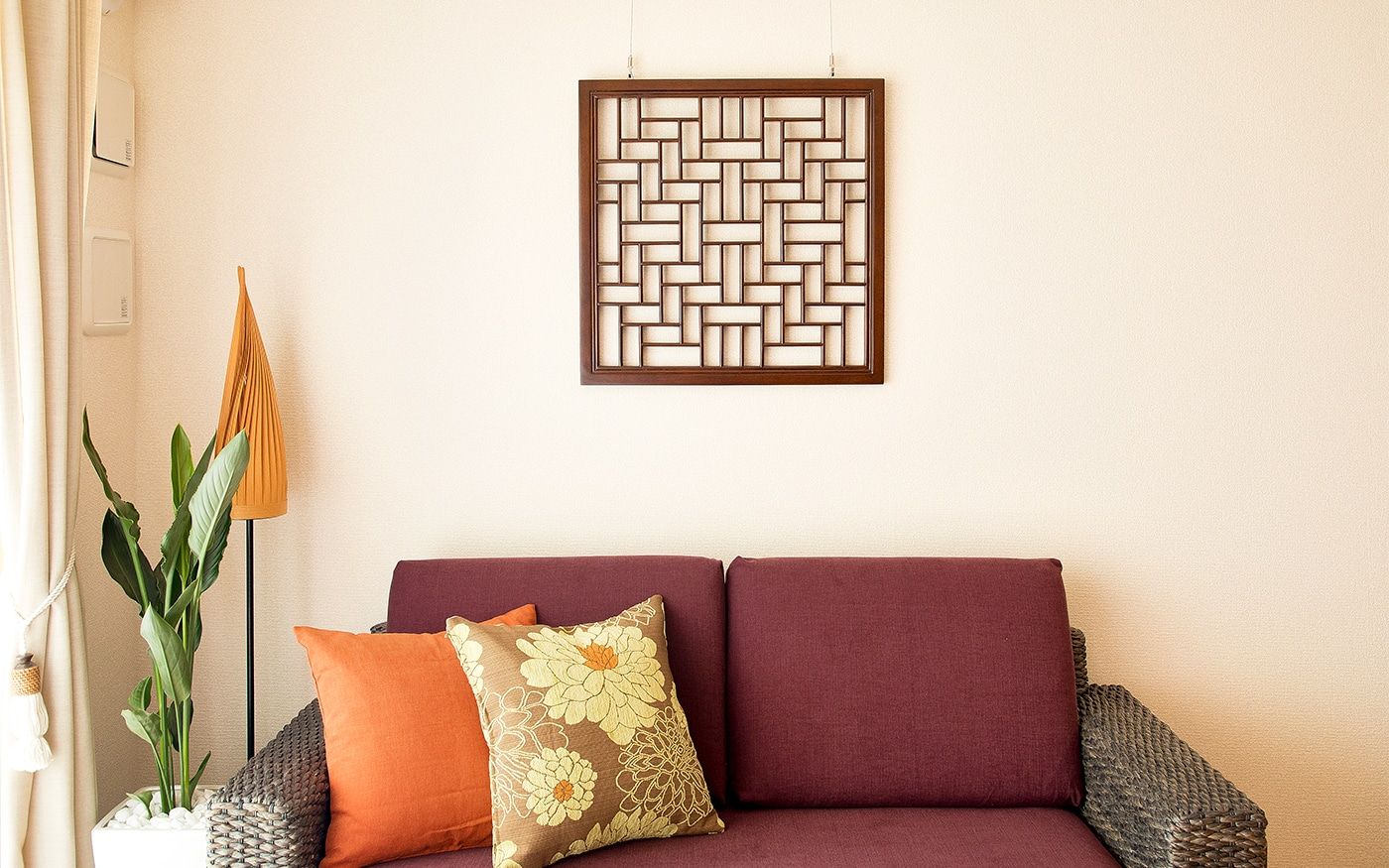 シックなダークグレー色のヒヤシンスソファを中心にファブリックなどで全体をトータルコーディネートされました。パープルとオレンジの配色、壁面装飾や小物雑貨などでアジアらしさを演出しているのがポイントです。