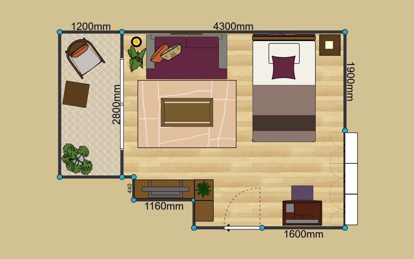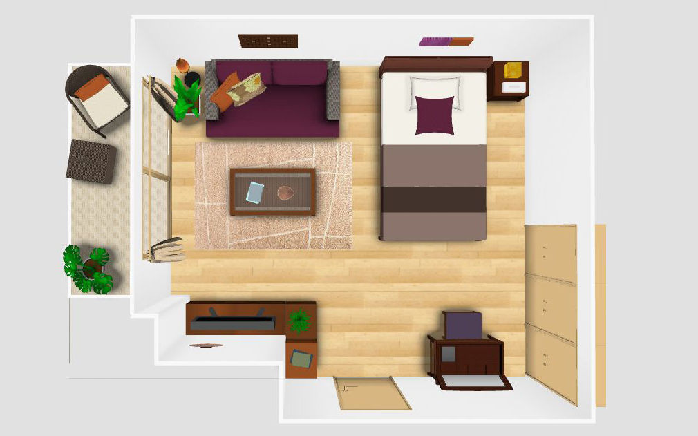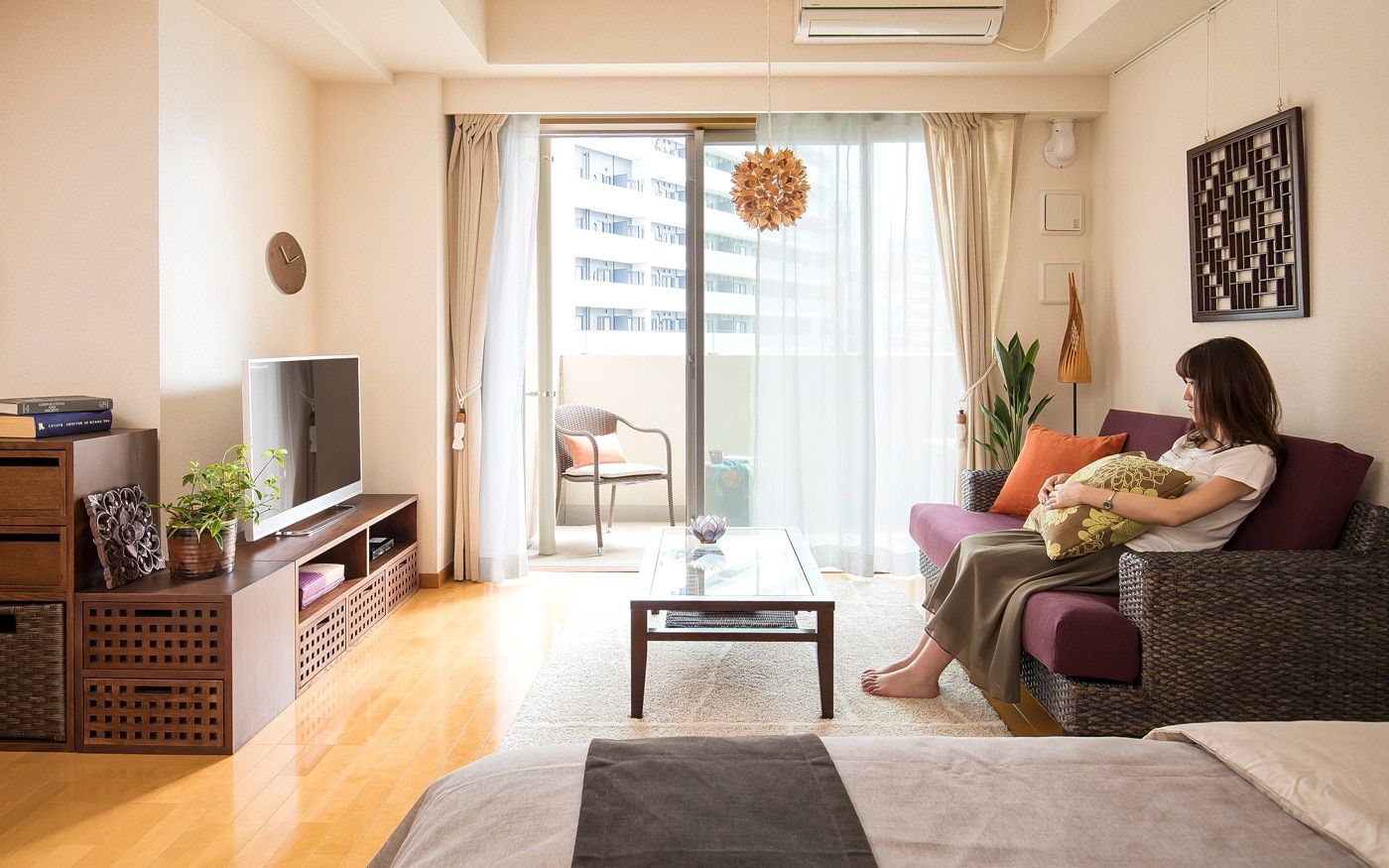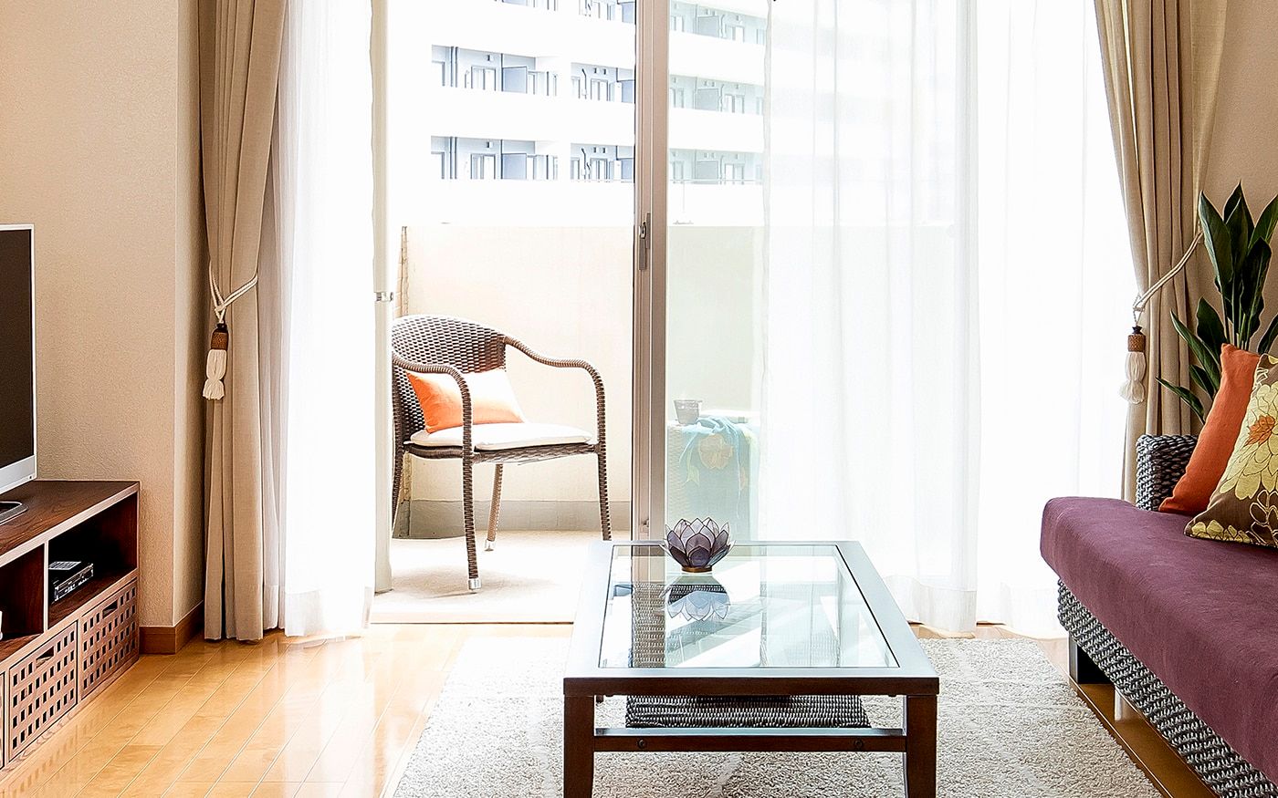 シックなダークグレー色のヒヤシンスソファを中心にファブリックなどで全体をトータルコーディネートされました。パープルとオレンジの配色、壁面装飾や小物雑貨などでアジアらしさを演出しているのがポイントです。