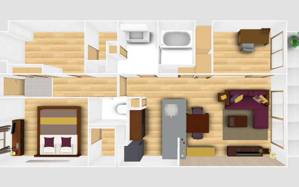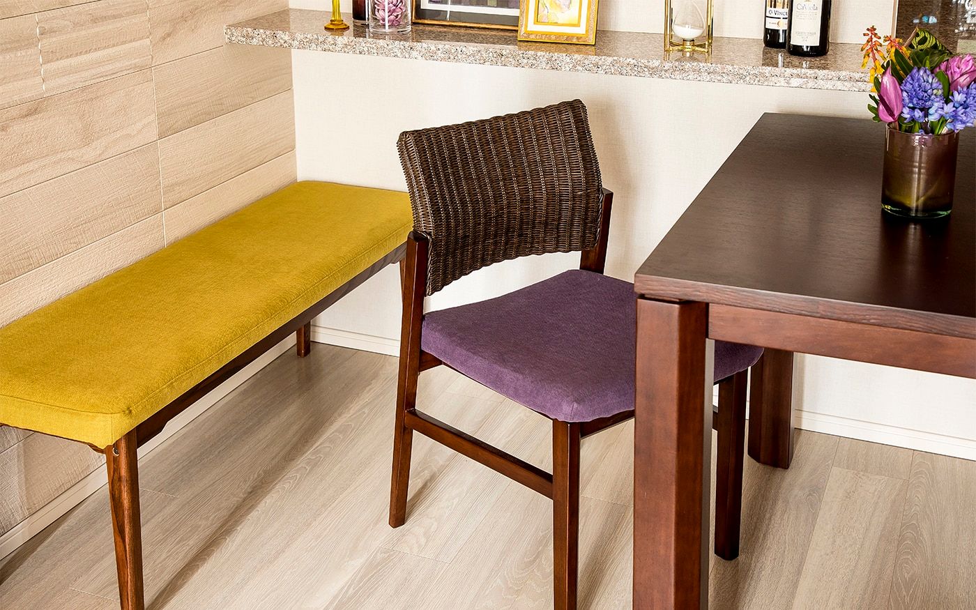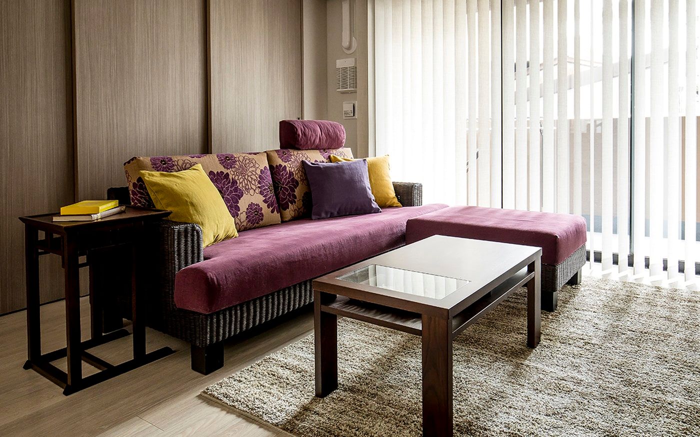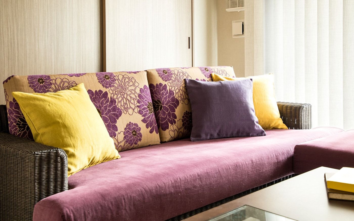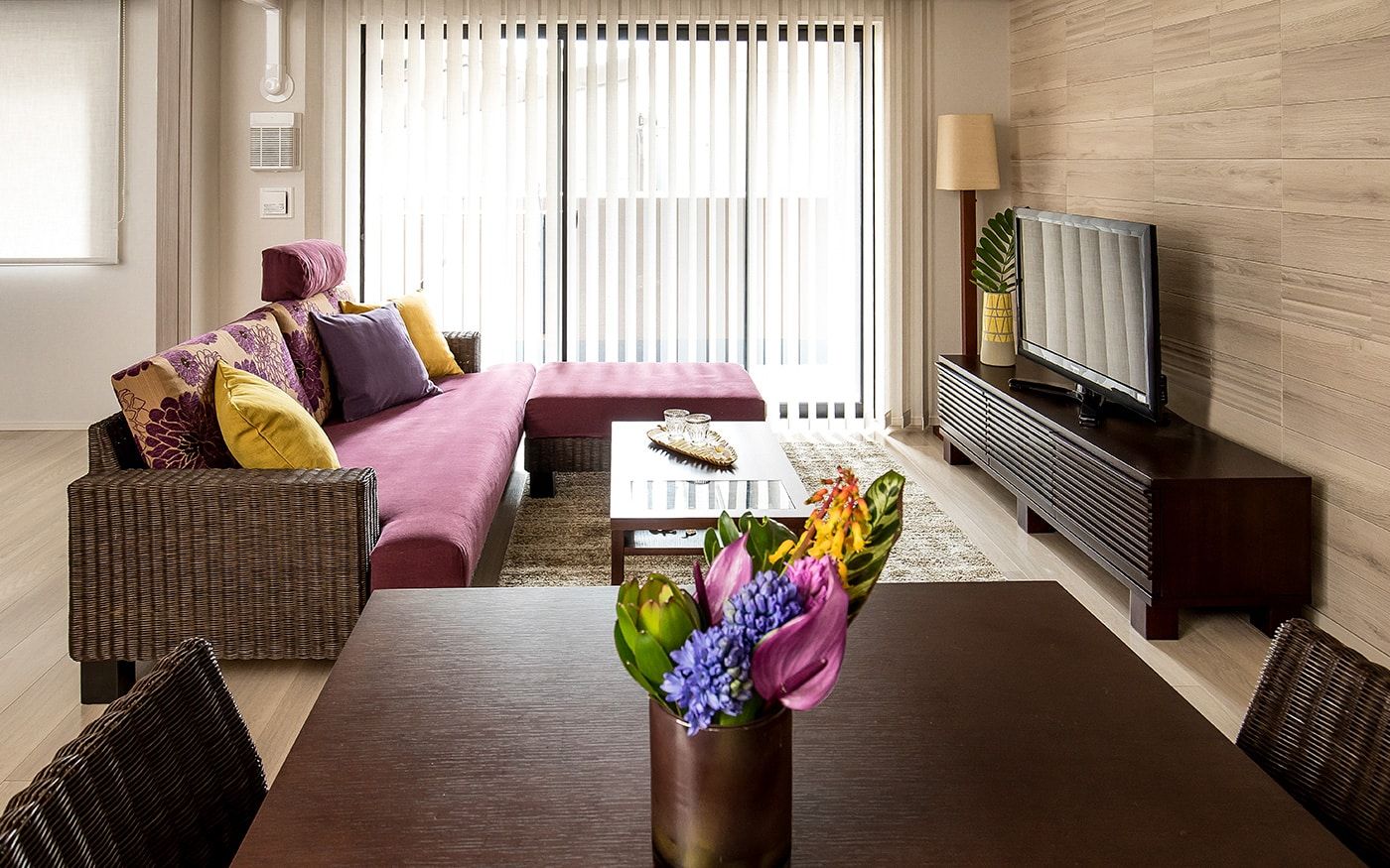 カラーのテーマは落ち着きのあるリゾートを演出するパープルを主役のカラーにして、パープルを引き立てるイエローを用いた組み合わせです。リビングルームは編み込み素材のソファをメインにアジアンリゾート空間を演出して、パープルとイエローのクッションカバーで彩りを添えています。