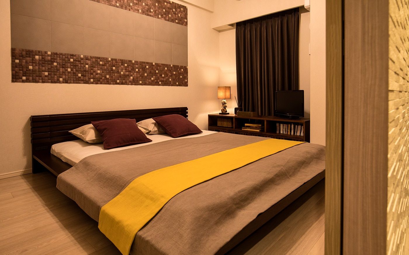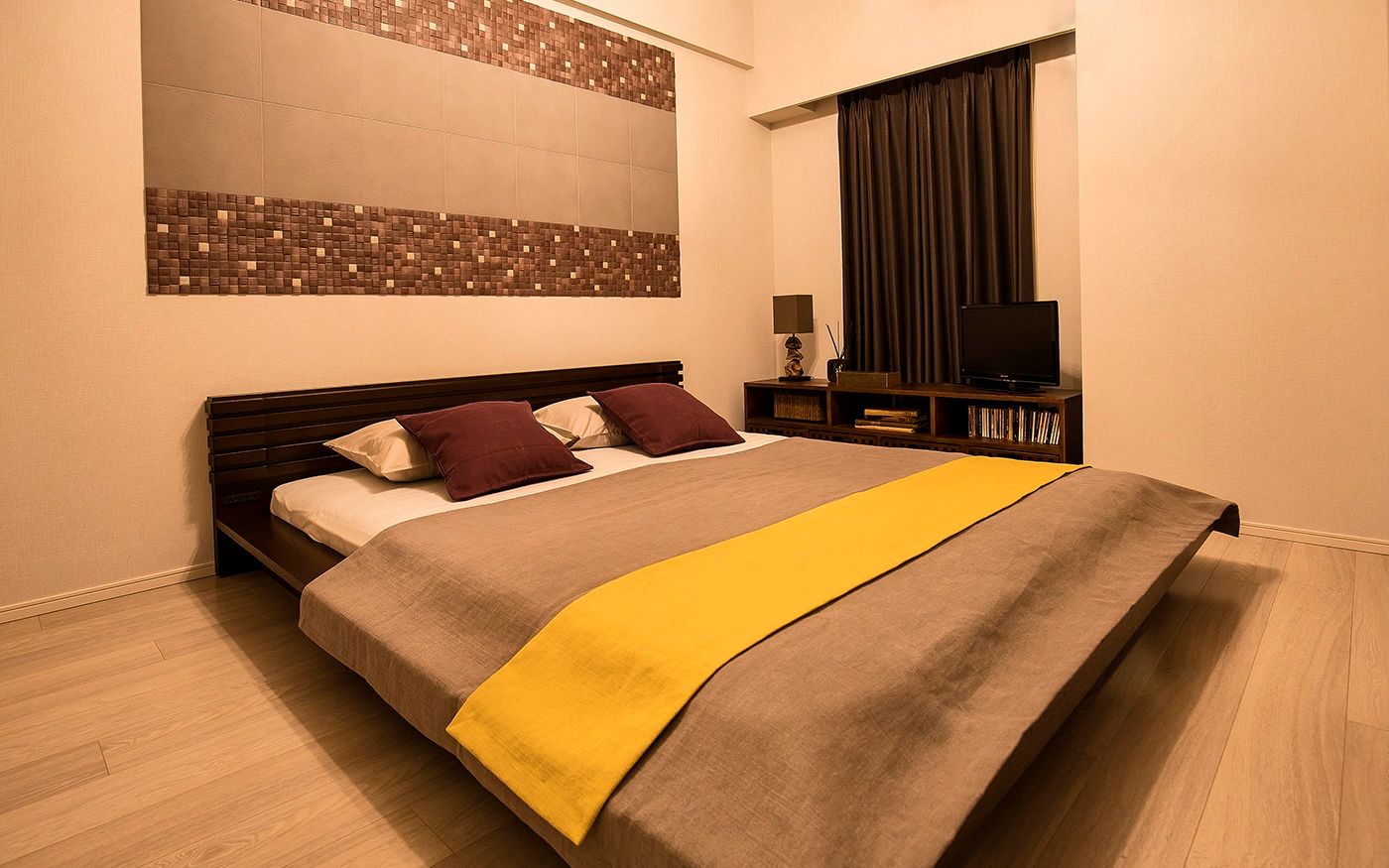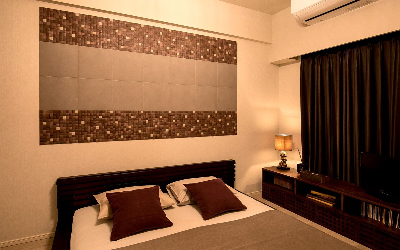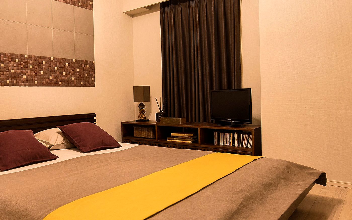 ベッドルームはお客様が気に入られたリゾートホテルライクな内装材が施されており、その雰囲気に合わせてアジアン風のローベッドを選ばれています。周辺に置いた寝室用のテレビボードや照明、ファブリックなどもイメージを合わせたことで、リゾートホテルで癒されるようにお休み頂けます。