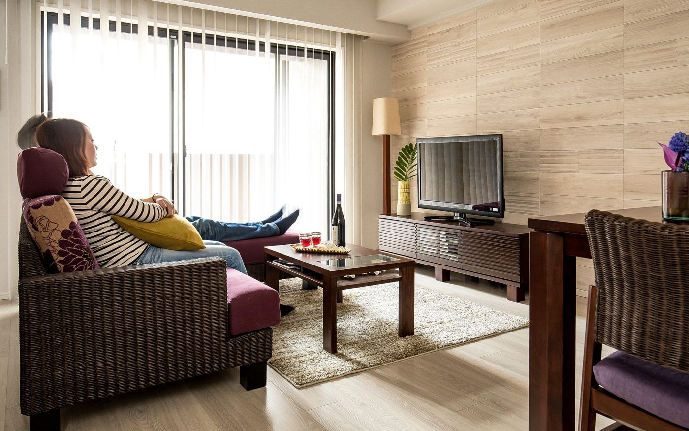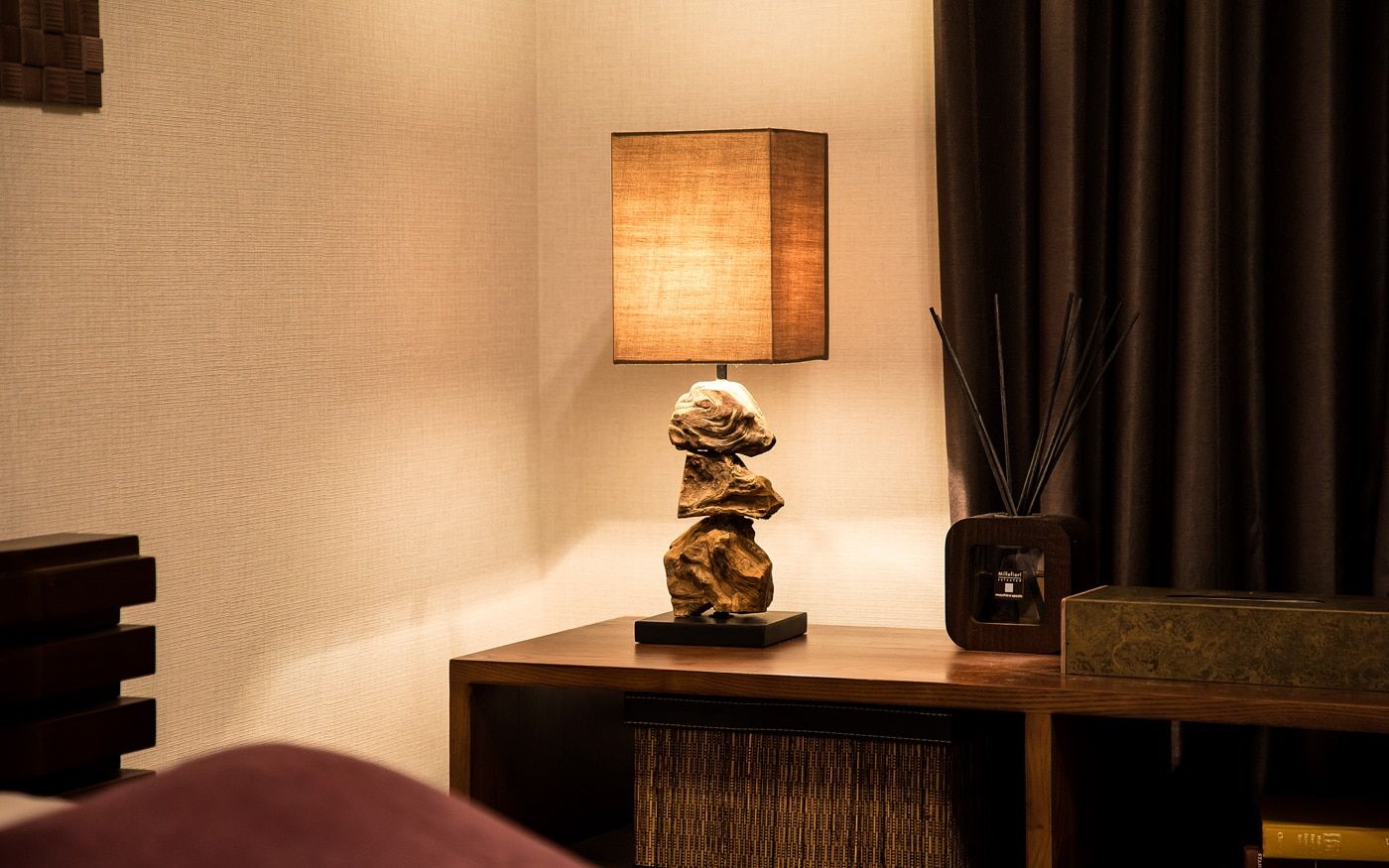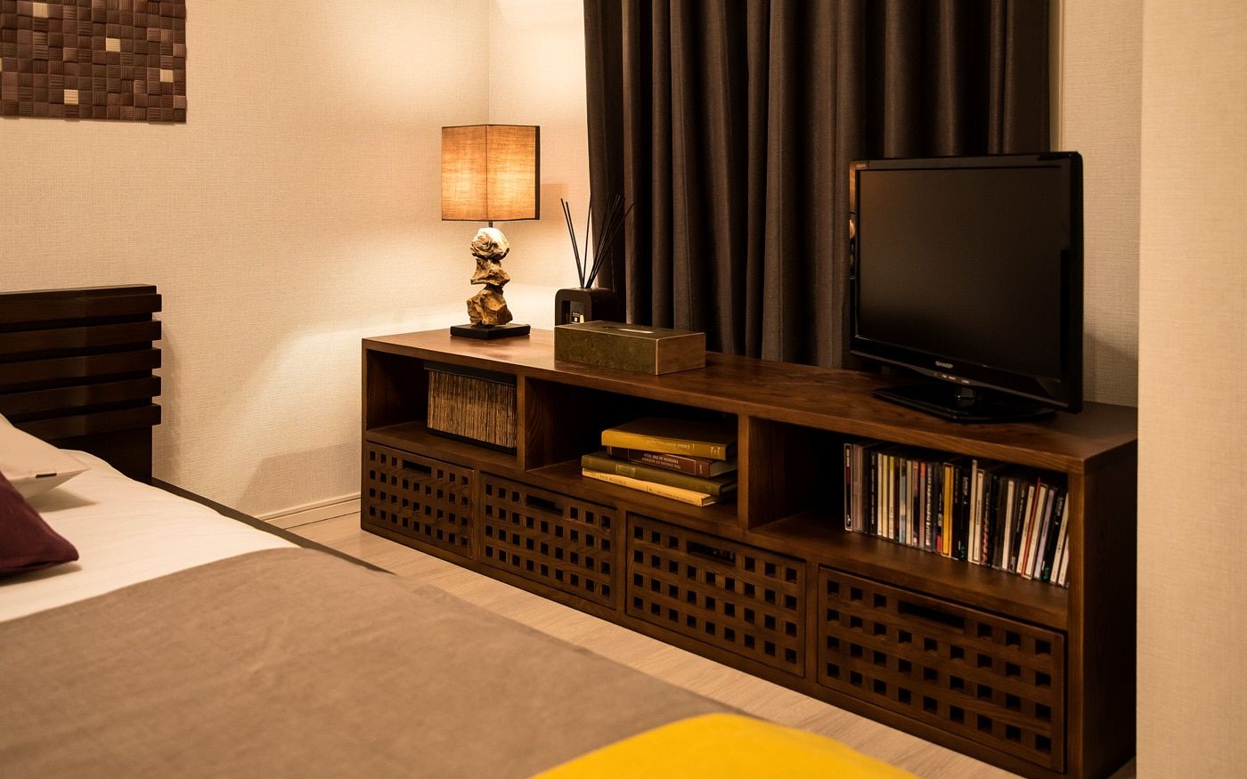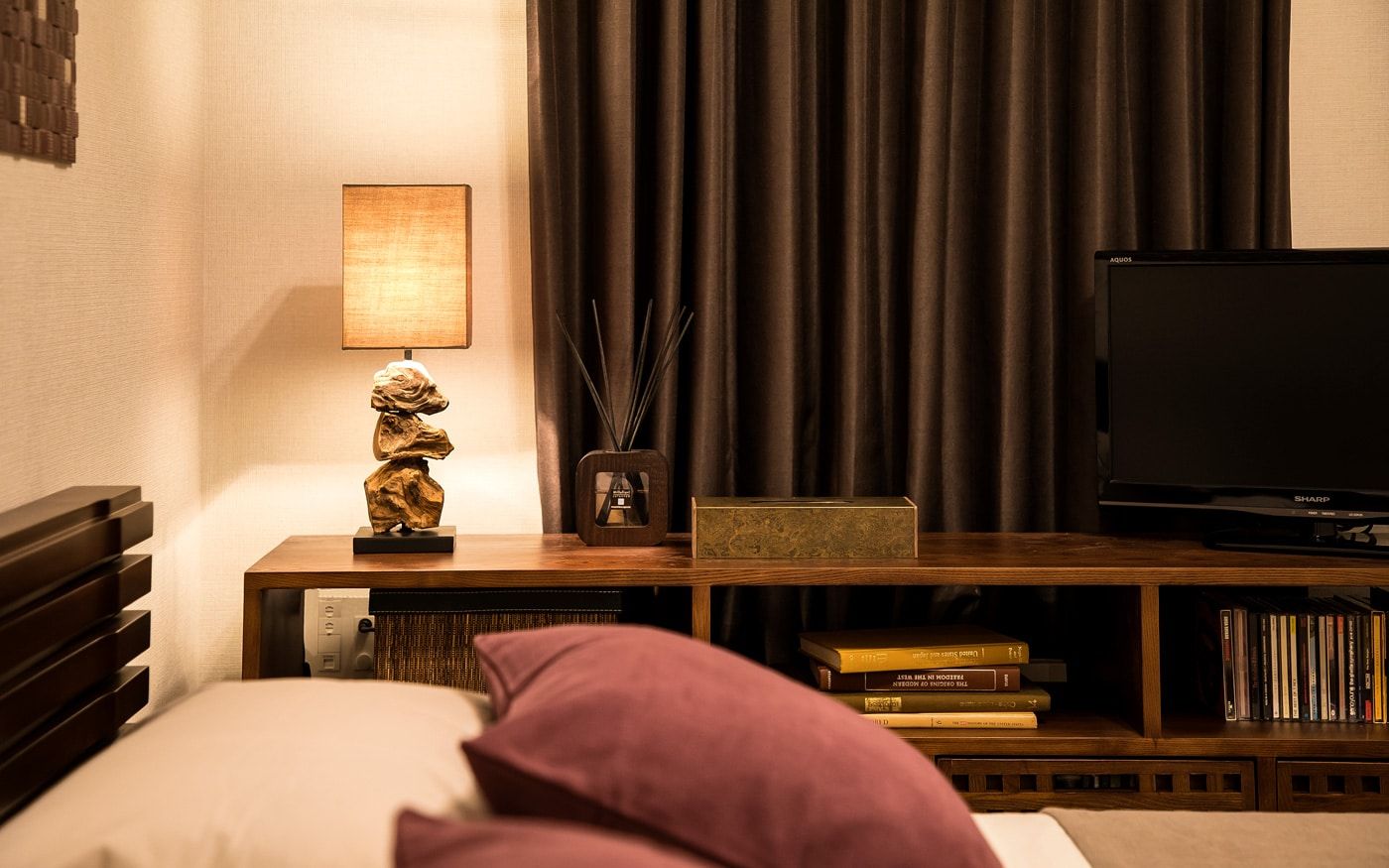 ベッドルームはお客様が気に入られたリゾートホテルライクな内装材が施されており、その雰囲気に合わせてアジアン風のローベッドを選ばれています。周辺に置いた寝室用のテレビボードや照明、ファブリックなどもイメージを合わせたことで、リゾートホテルで癒されるようにお休み頂けます。