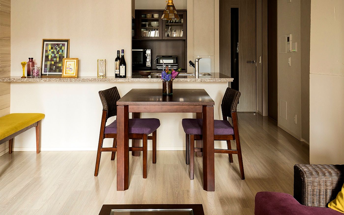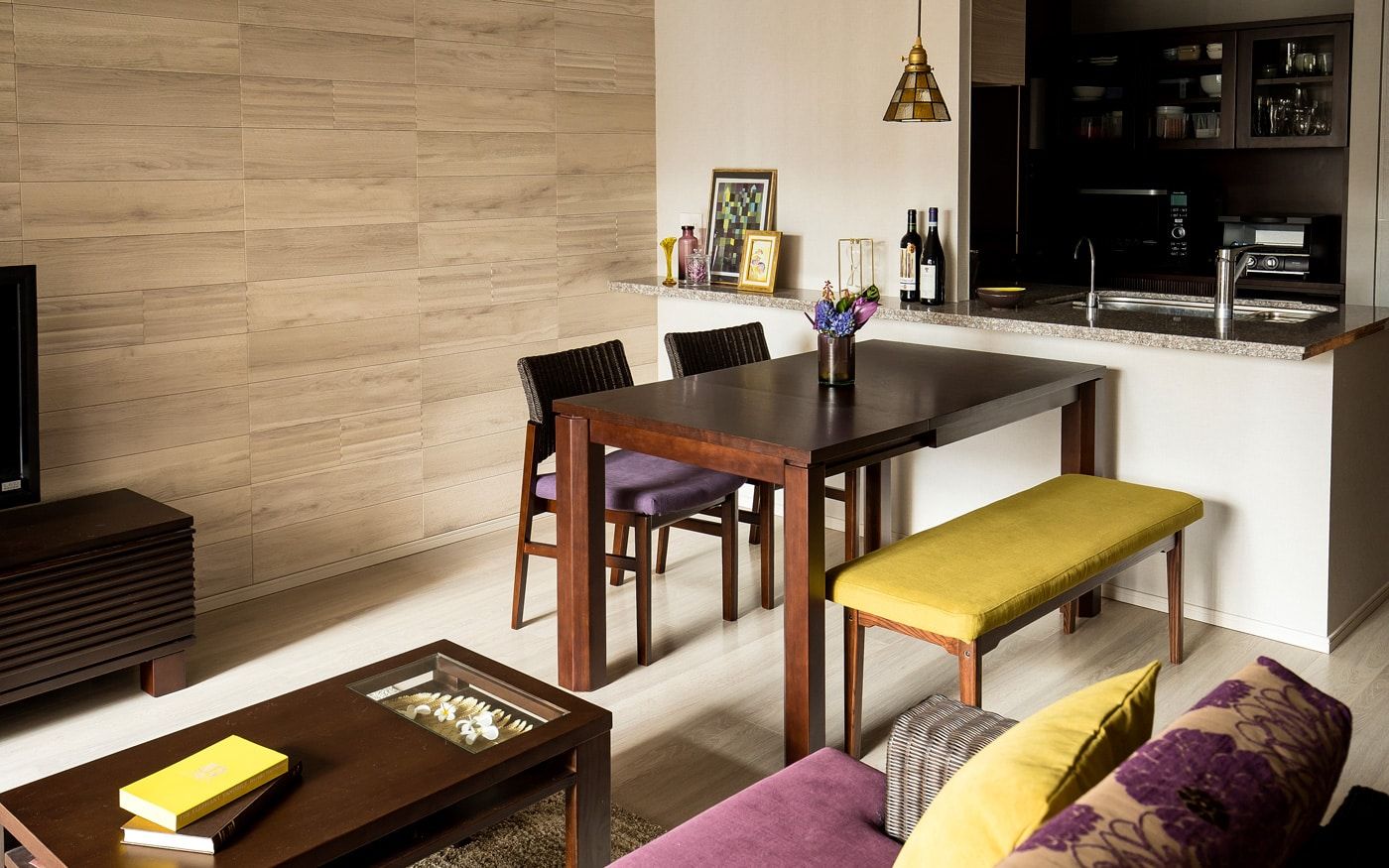 ダイニングルームのチェアカバーやカウンター周りの装飾も色合いを合わせることで、部屋全体の統一感を意識しました。壁一面に広がる石材(エコカラット)やフロアランプ、爽やかなバーチカルブラインドがアジアンリゾートらしさをプラスしています。
