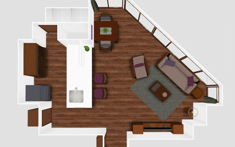 リビングダイニングルームの第一印象を決めるカラーコーディネート。大きな窓から自然光が差し込む開放的な空間に、ダークブラウンの木材家具とブラックラタン(籐)の家具フレームが空間全体の輪郭をはっきりと魅せ、高級感を演出します。