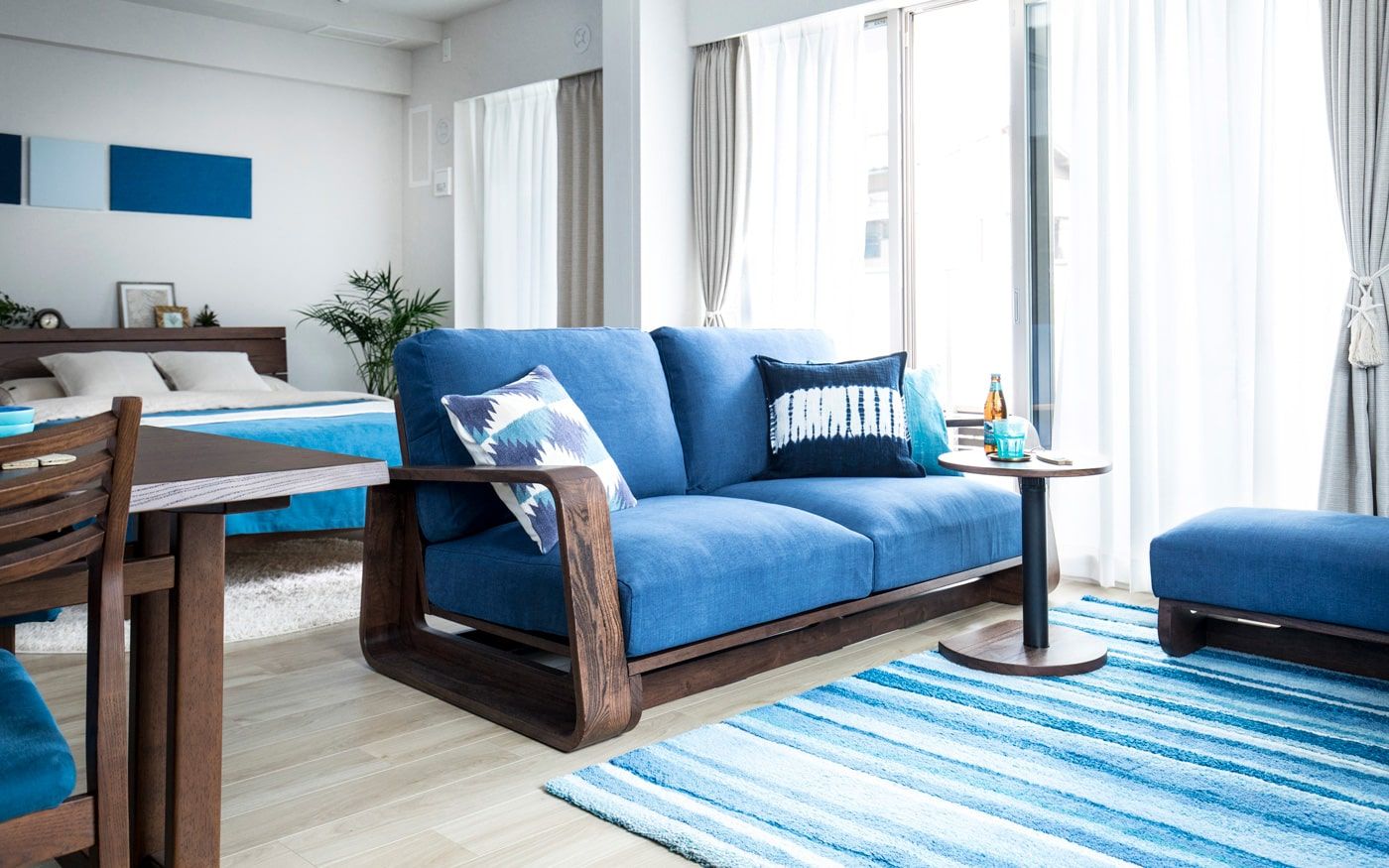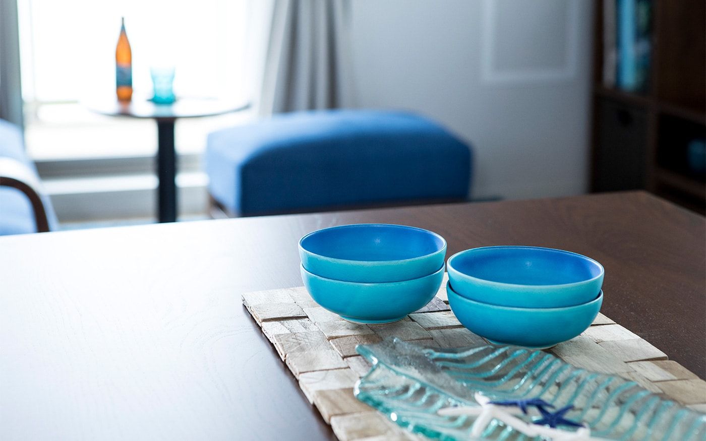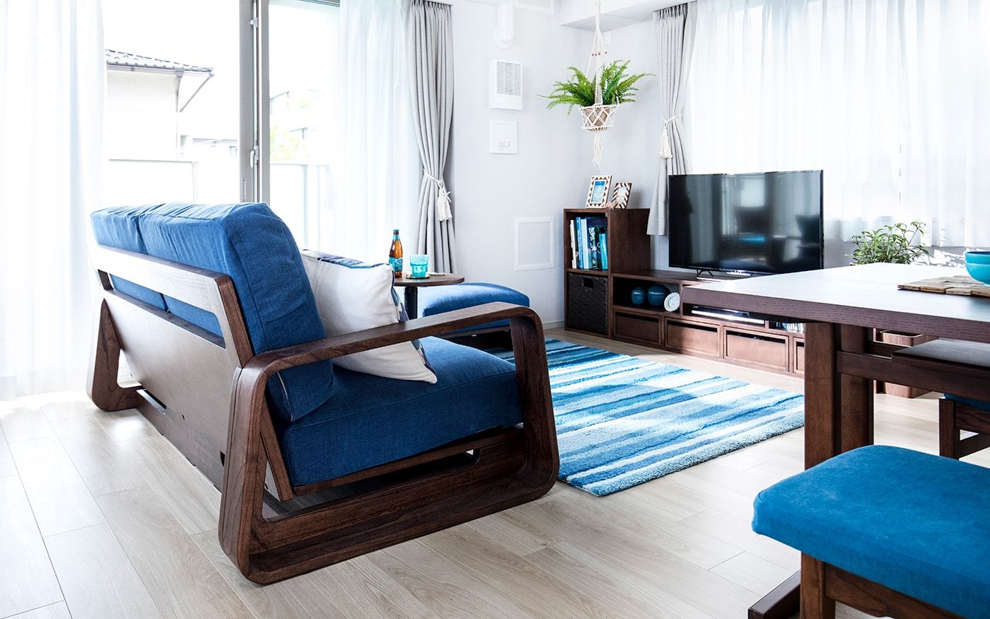 自宅の顔となるリビングルーム。存在感がありながらも、穏やかで心地良い空間を演出する深いブルーの色合いに包まれれば、まるで海辺でリラックスしているようなゆったりとした時間を愉しめます。
