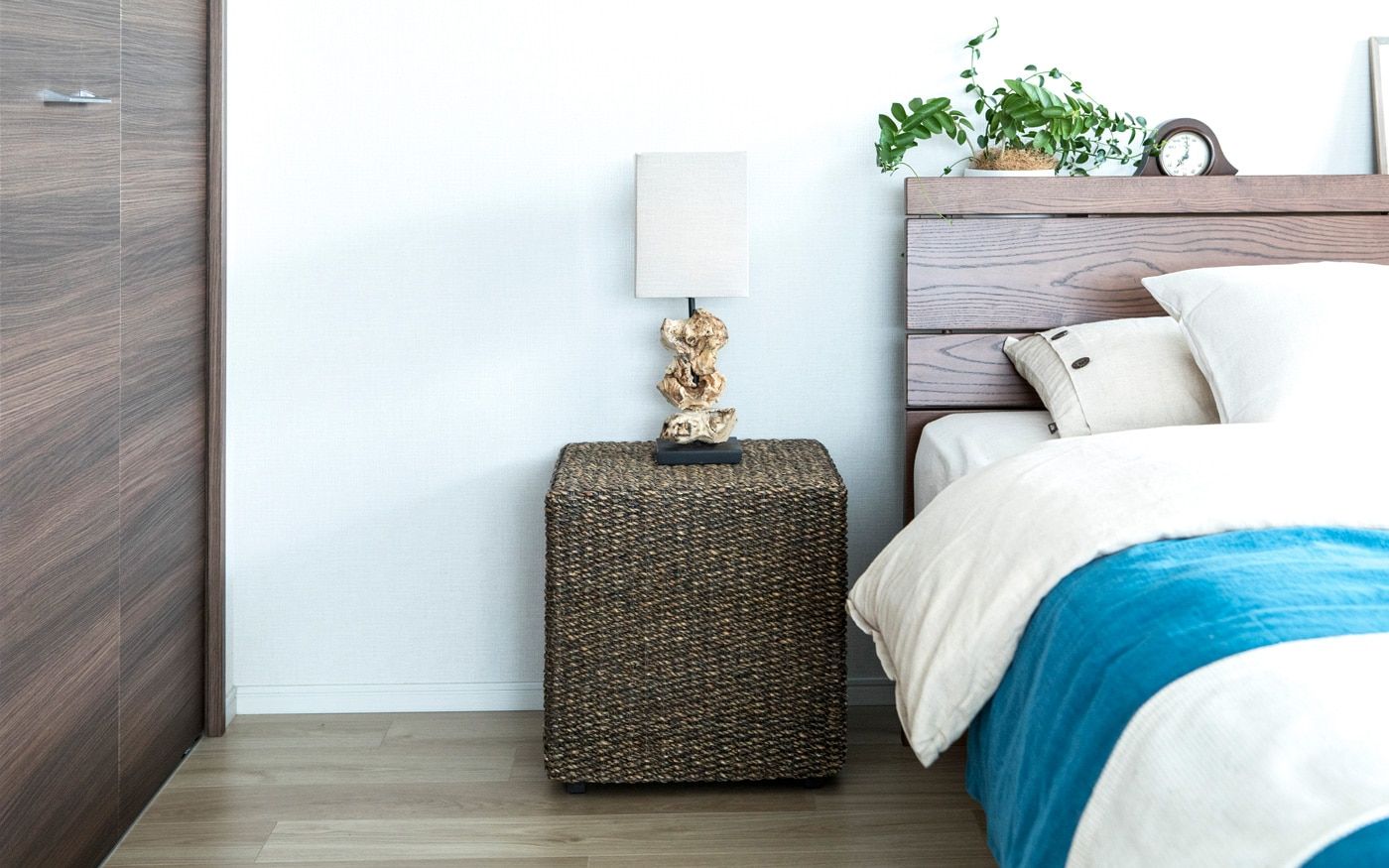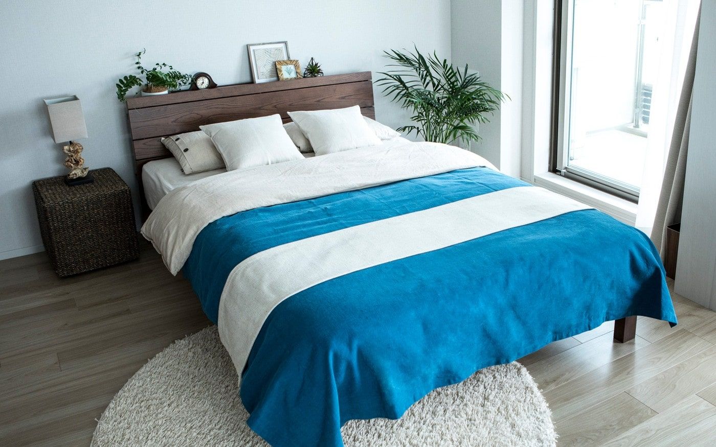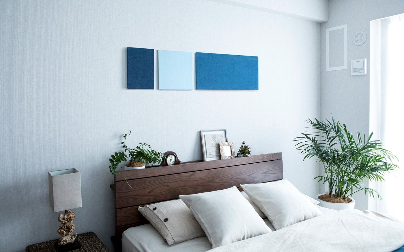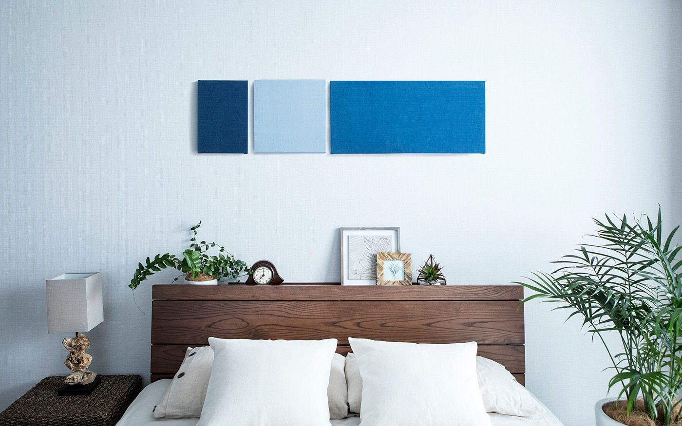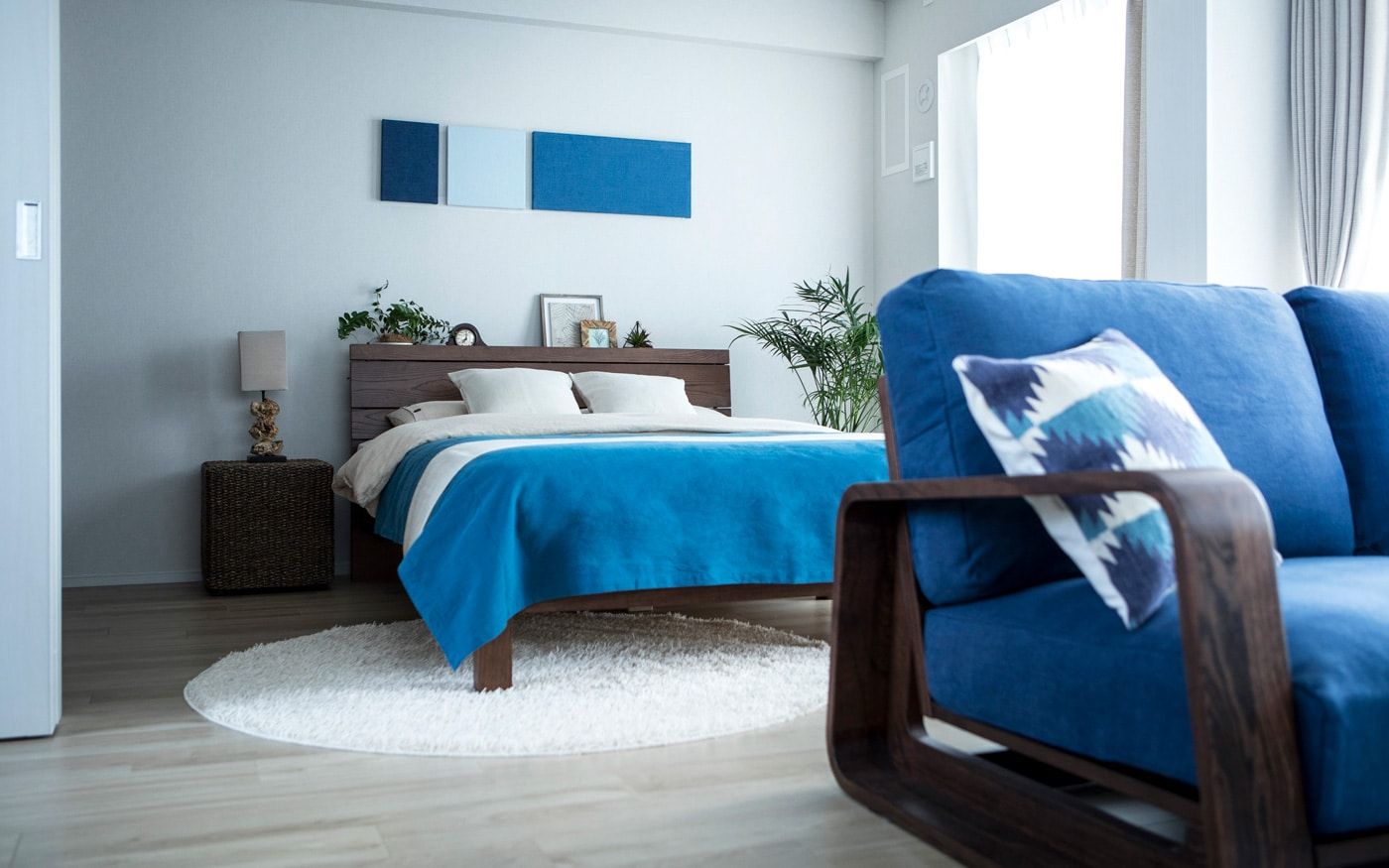 ベッドルームもリビングダイニングルームに隣接しているため、深みあるターコイズブルーを中心にコーディネートして繋がりを出しました。心が軽くなるような更にリラックスした時間を過ごせるよう、ホワイトを組み合わせて清々しさを感じられる雰囲気に。