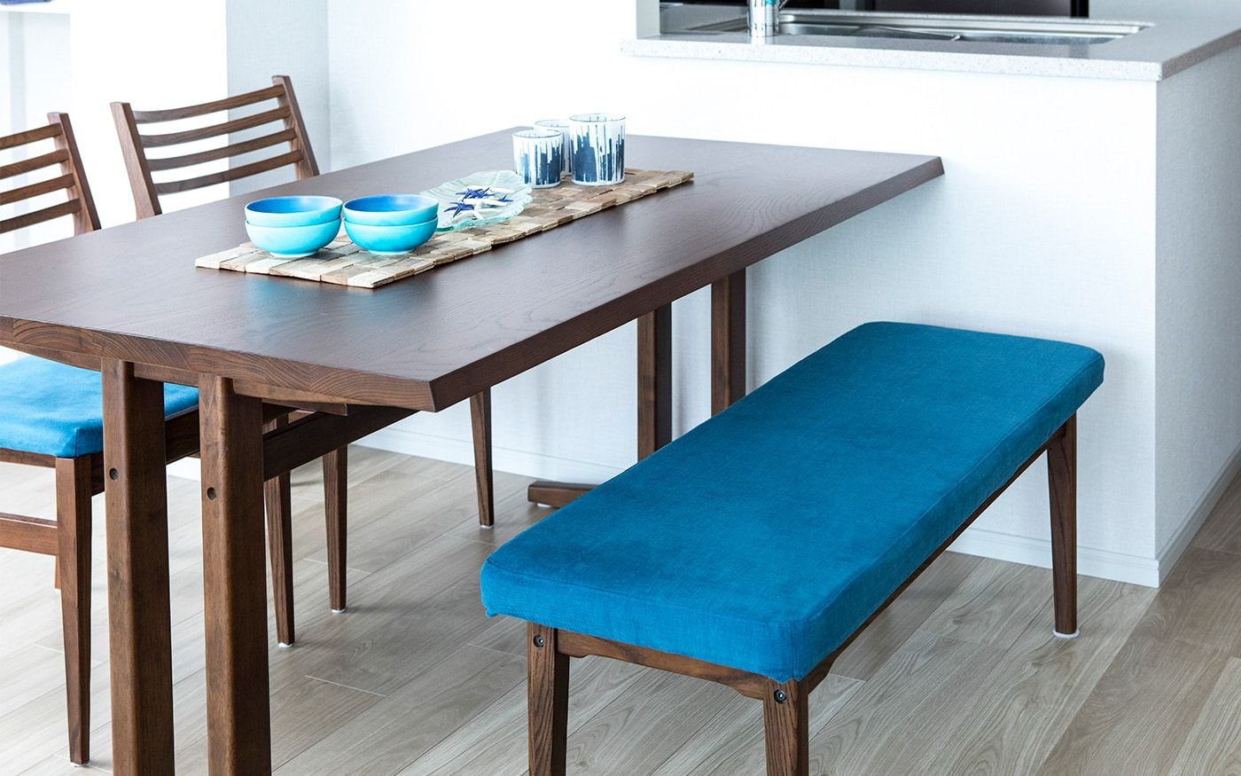 リビングに隣接するダイニングルームも統一感を意識して、深みのあるブルーと無垢材の家具でコーディネートしました。また、後ろのスペースには西海岸らしいオブジェやポスター等の小物を飾り付けておしゃれに。