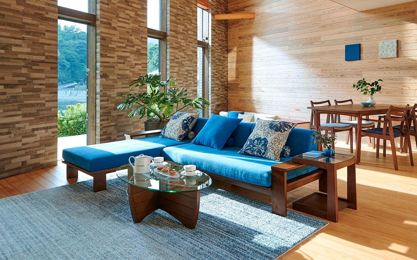 自宅の顔となるリビングルーム。存在感がありながらも、穏やかで心地良い空間を演出する深いブルーの色合いに包まれれば、まるで海辺でリラックスしているようなゆったりとした時間を愉しめます。