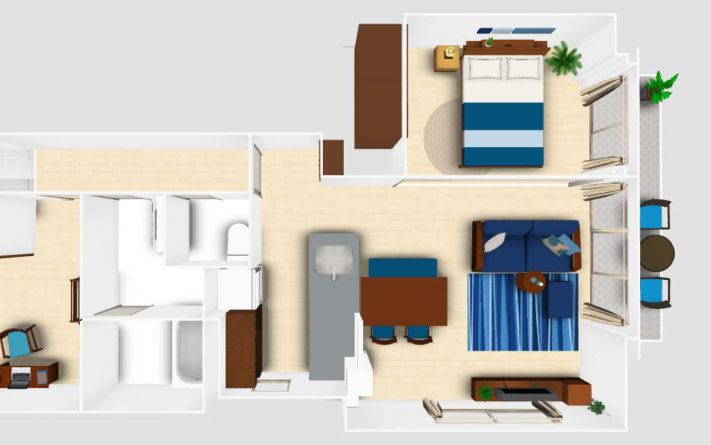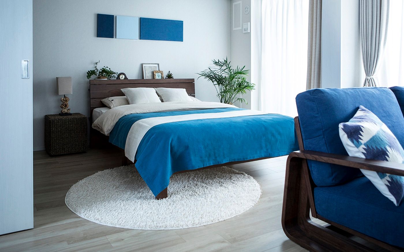 ベッドルームもリビングダイニングルームに隣接しているため、深みあるターコイズブルーを中心にコーディネートして繋がりを出しました。心が軽くなるような更にリラックスした時間を過ごせるよう、ホワイトを組み合わせて清々しさを感じられる雰囲気に。