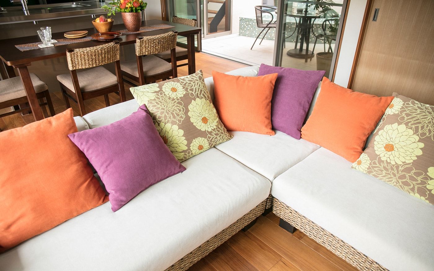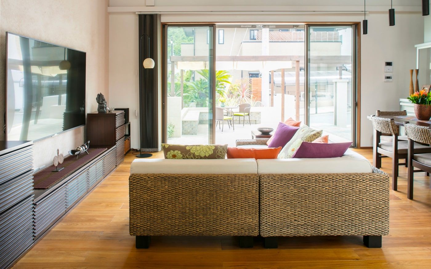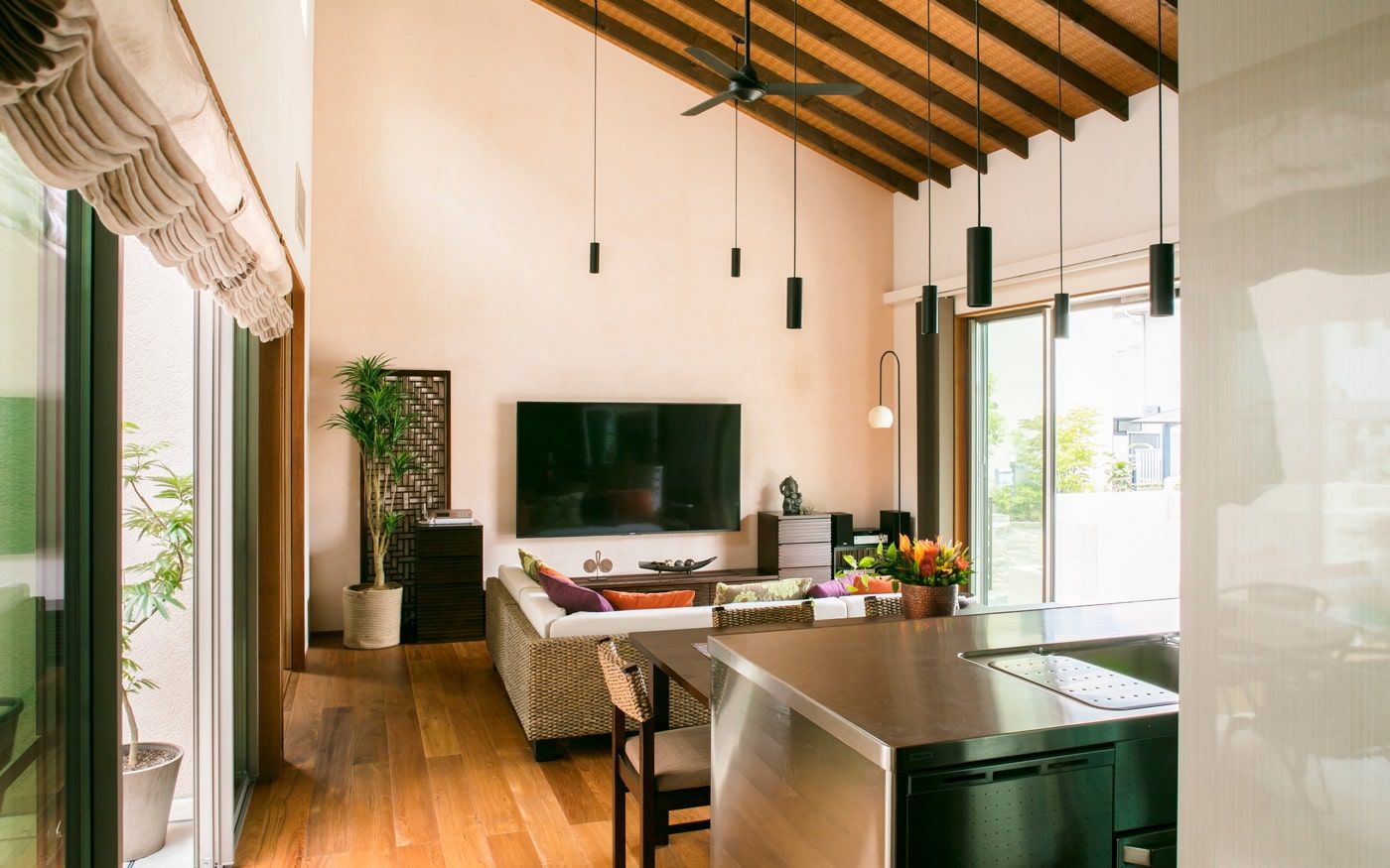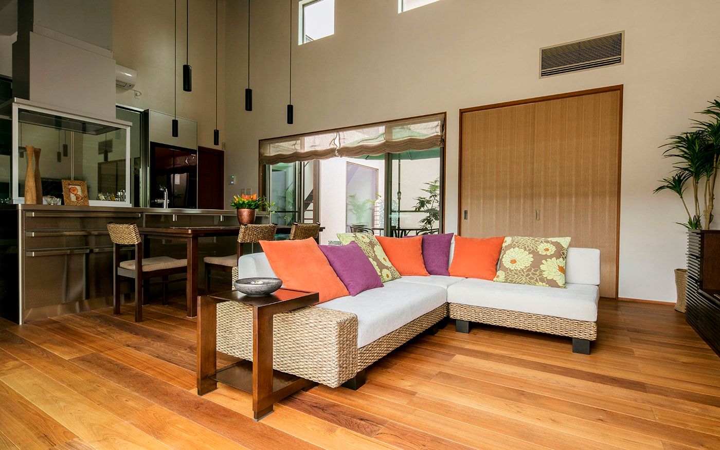 アジアンリゾートで過ごす心地良い時間には開放的なムードが不可欠。こちらのお客様宅でも、そのようなリゾートの広々とした気持ちの良い空間をそのまま自宅に再現しました。家族みんなでゆったりと寛げる大きなコーナーソファでも、ロースタイルを選ぶことで、圧迫感の無い空間に仕上がります。