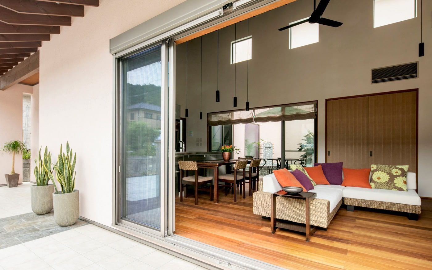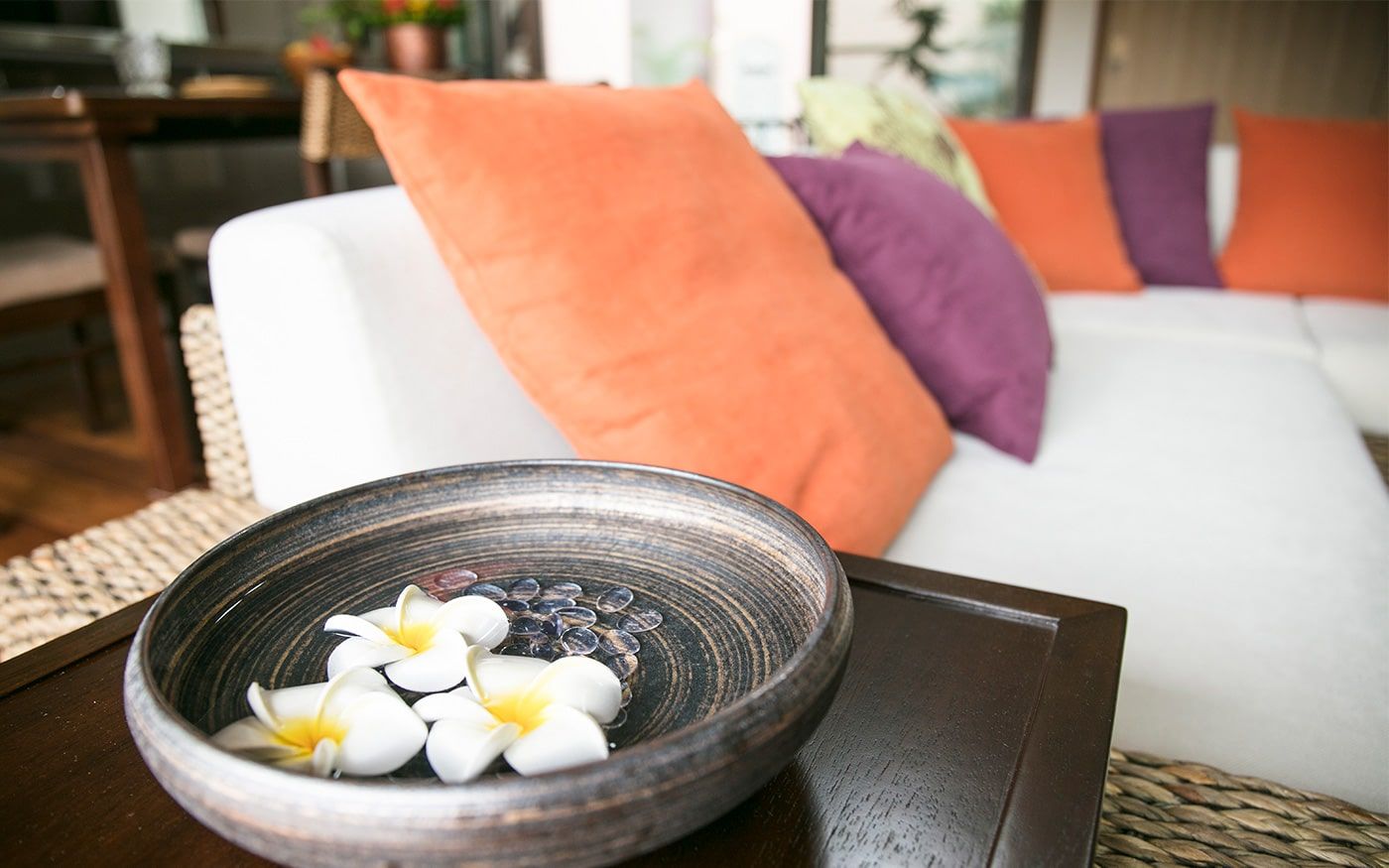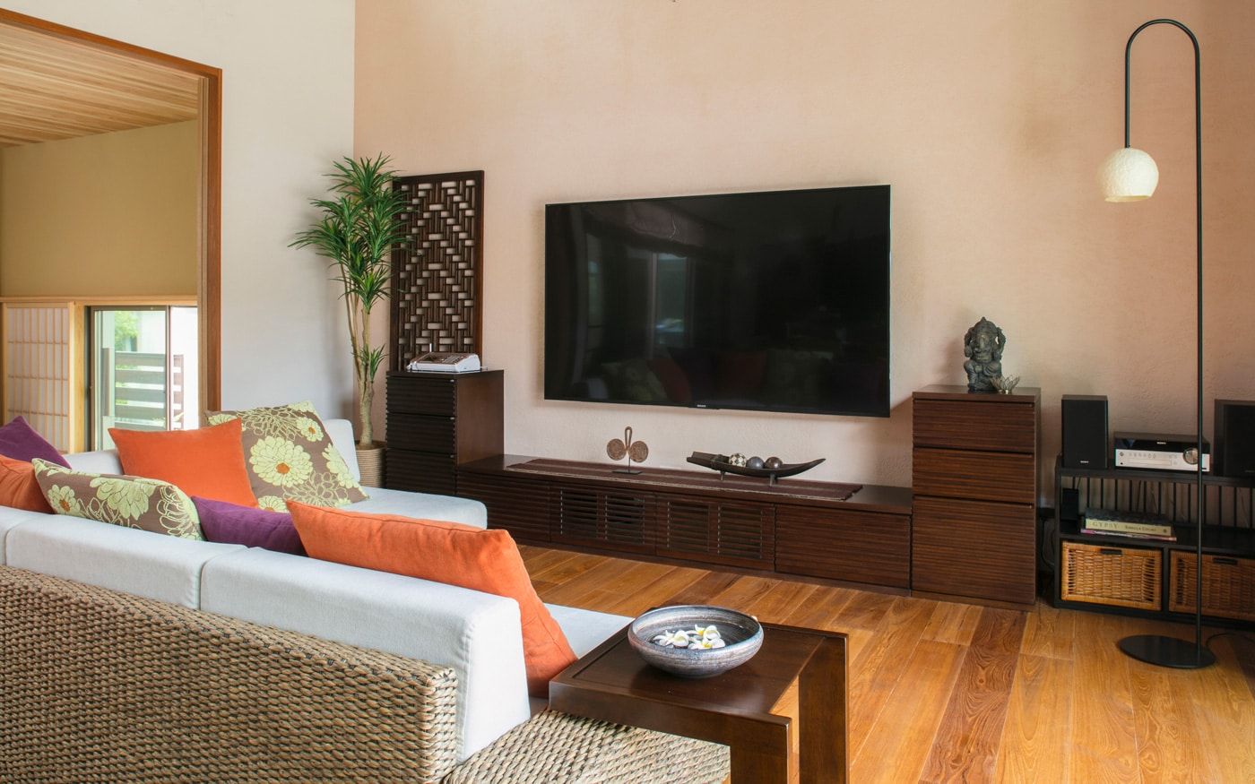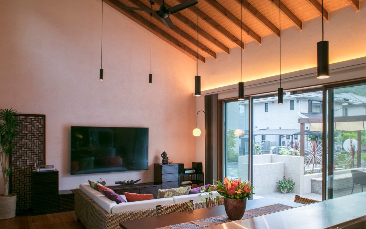 アジアンリゾートで過ごす心地良い時間には開放的なムードが不可欠。こちらのお客様宅でも、そのようなリゾートの広々とした気持ちの良い空間をそのまま自宅に再現しました。家族みんなでゆったりと寛げる大きなコーナーソファでも、ロースタイルを選ぶことで、圧迫感の無い空間に仕上がります。