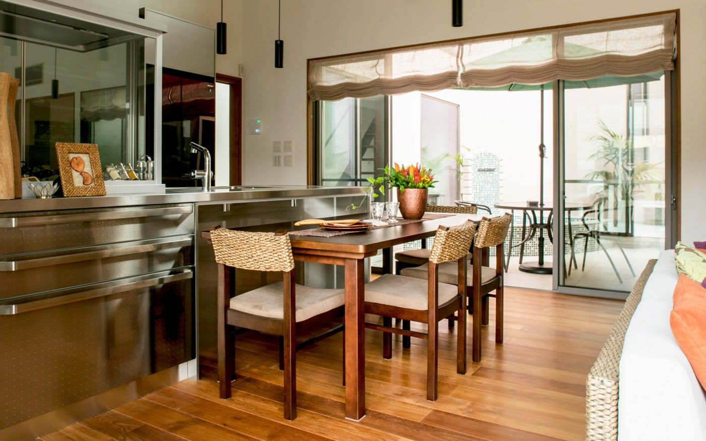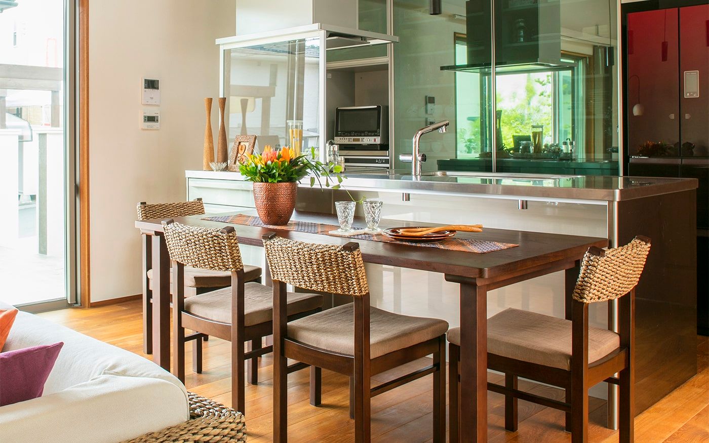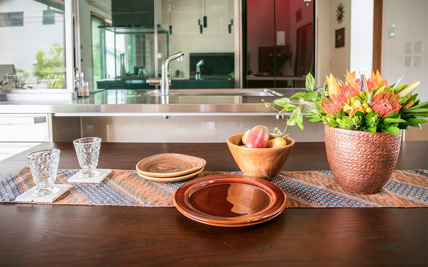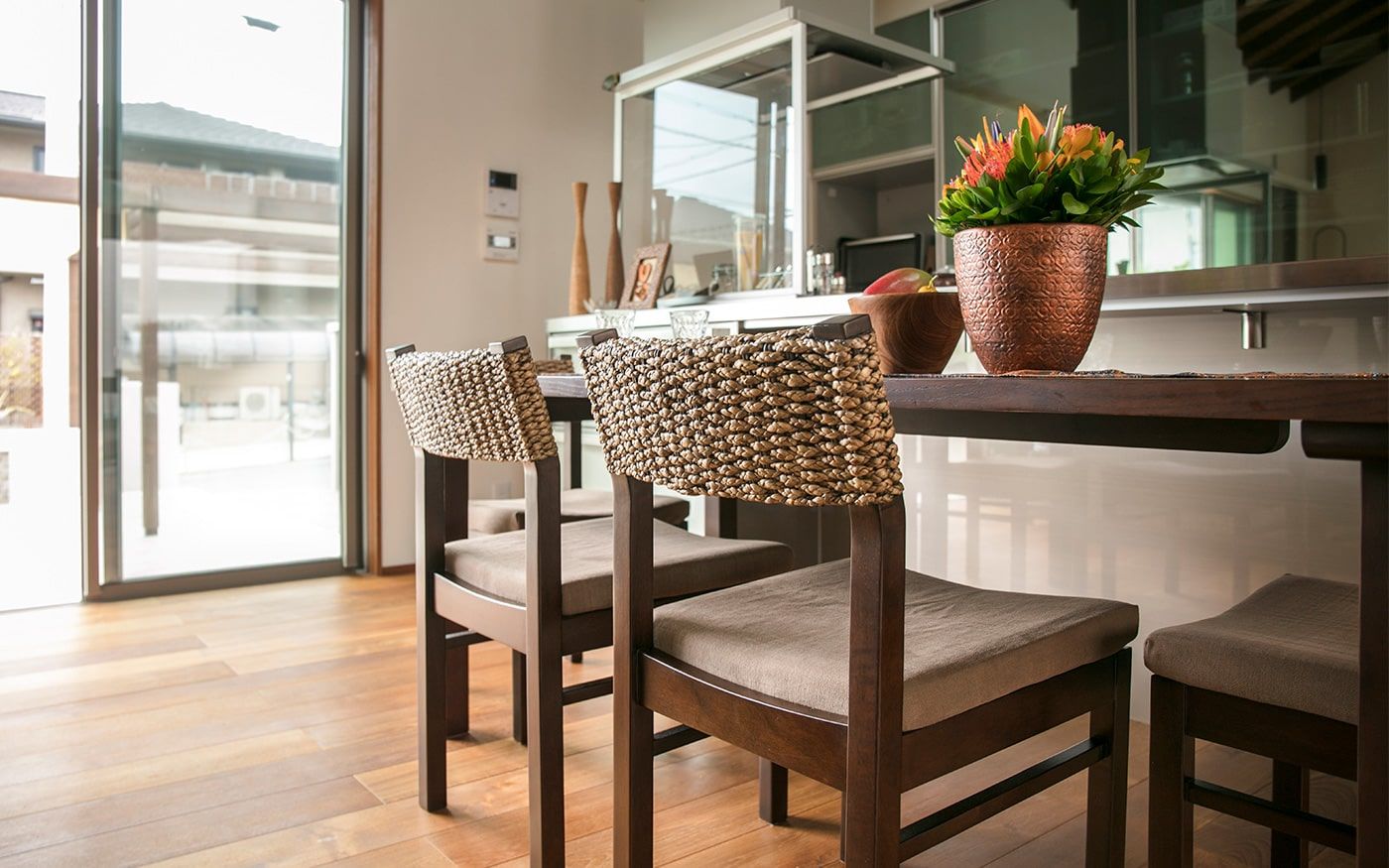 アジアンリゾートで過ごす心地良い時間には開放的なムードが不可欠。こちらのお客様宅でも、そのようなリゾートの広々とした気持ちの良い空間をそのまま自宅に再現しました。家族みんなでゆったりと寛げる大きなコーナーソファでも、ロースタイルを選ぶことで、圧迫感の無い空間に仕上がります。