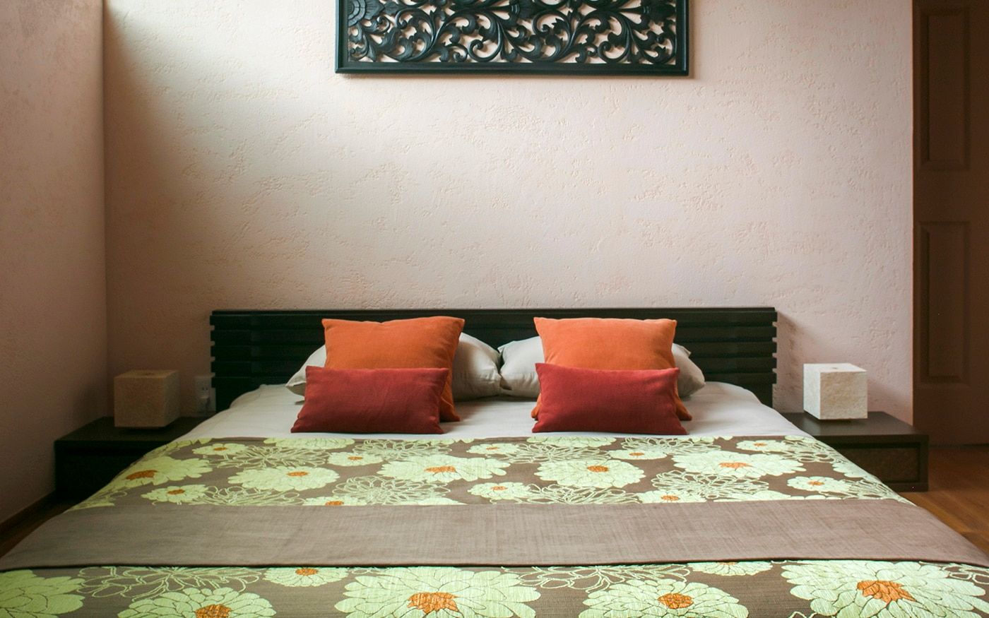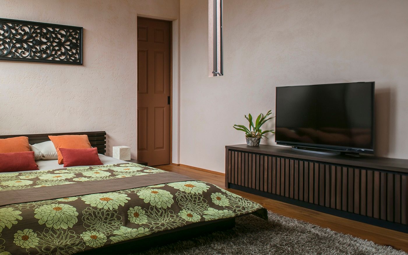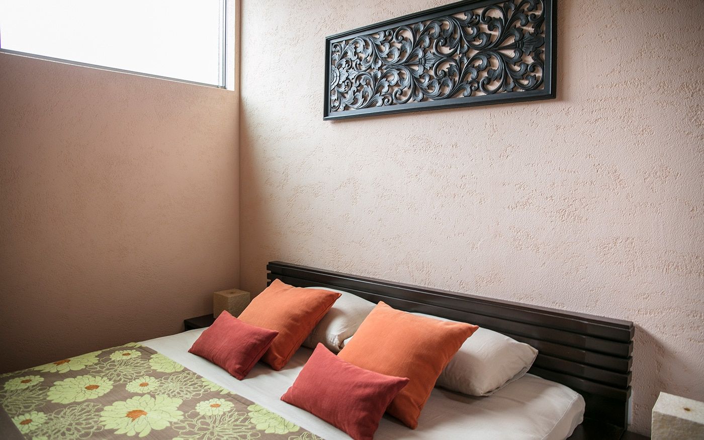 ゆったりとした時間が流れるベッドルームの主役は、優雅さを纏ったコト・ローベッド。アジアンリゾートらしい開放感を演出するローデザインで、質の高い眠りを実現する厚みのあるマットレスと組み合わせても、高い天井と広々とした空間が手に入ります。また、ウッドレリーフが良いおしゃれなアクセントに。