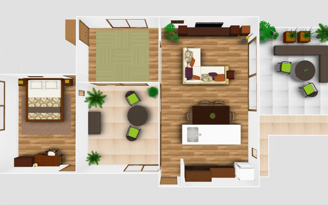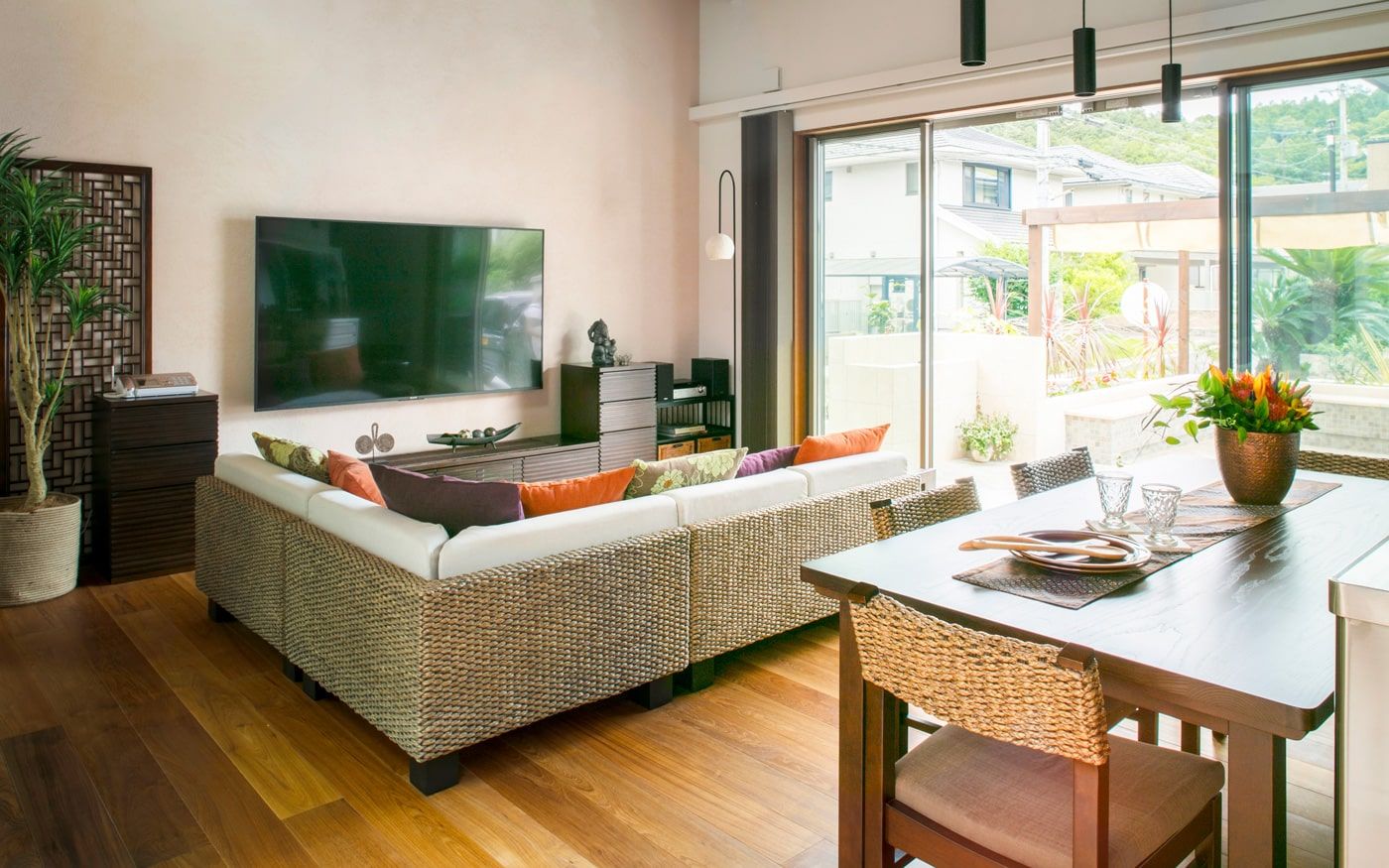 アジアンリゾートで過ごす心地良い時間には開放的なムードが不可欠。こちらのお客様宅でも、そのようなリゾートの広々とした気持ちの良い空間をそのまま自宅に再現しました。家族みんなでゆったりと寛げる大きなコーナーソファでも、ロースタイルを選ぶことで、圧迫感の無い空間に仕上がります。