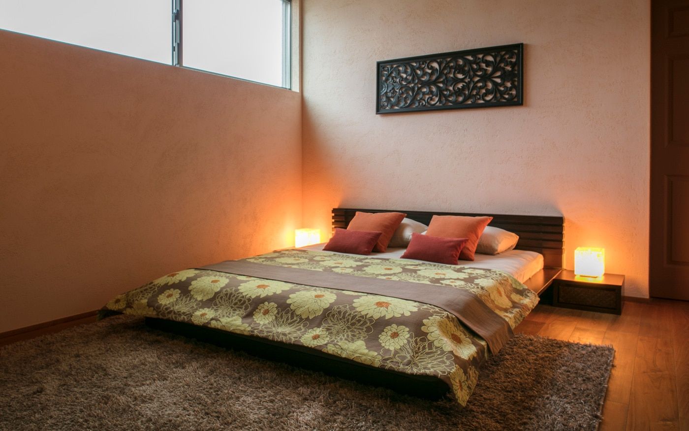 ゆったりとした時間が流れるベッドルームの主役は、優雅さを纏ったコト・ローベッド。アジアンリゾートらしい開放感を演出するローデザインで、質の高い眠りを実現する厚みのあるマットレスと組み合わせても、高い天井と広々とした空間が手に入ります。また、ウッドレリーフが良いおしゃれなアクセントに。