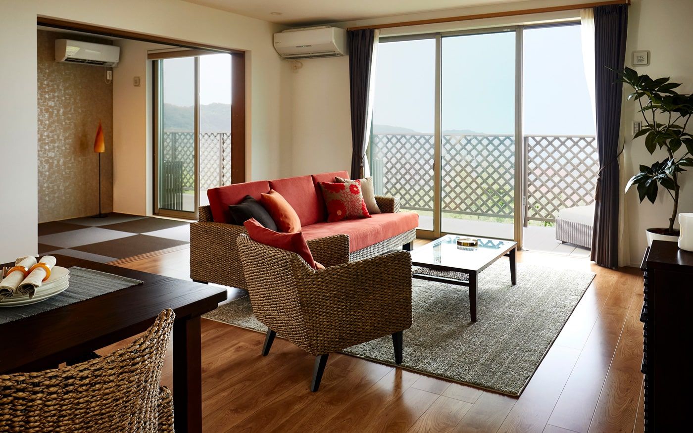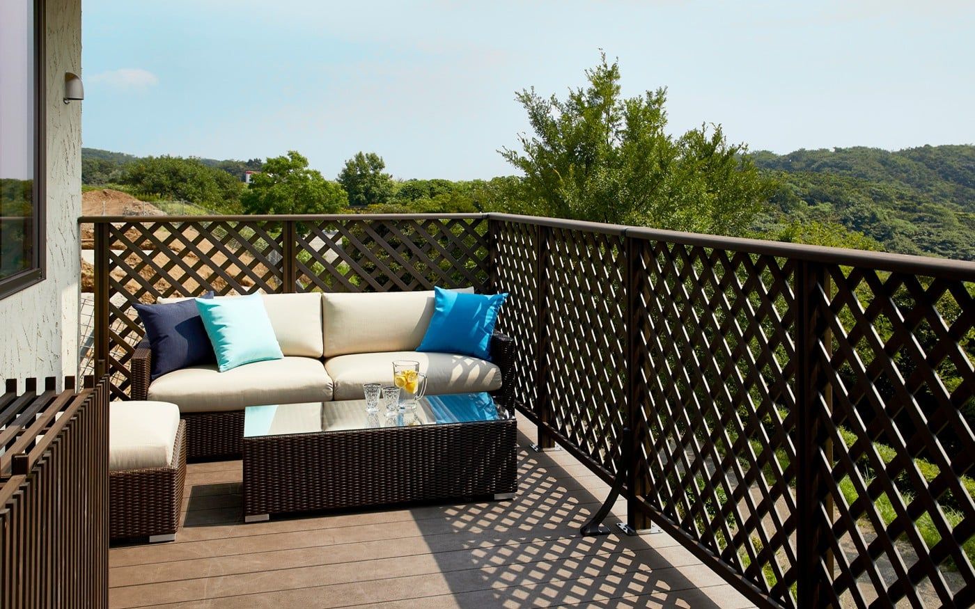 バルコニーでは、湘南の海をイメージしたブルーとホワイトで爽やかなカラーコーディネートを行いました。目を瞑り、光を浴び、風を感じながら自然と一体になって寛ぐ時間。別荘という非日常的な空間だからこそ叶えられる究極の贅沢です。